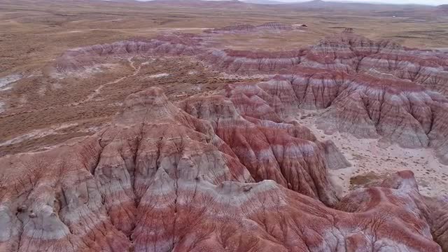 1121570 - Aerial view of textured red desert in Wyoming flying down