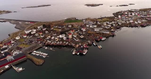 964258 - Aerial shot of Lofoten cityscape at sunset with islands and red houses in view