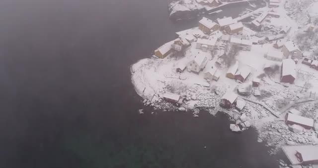 964286 - Aerial shot over red wooden houses at daytime with snowy landscape