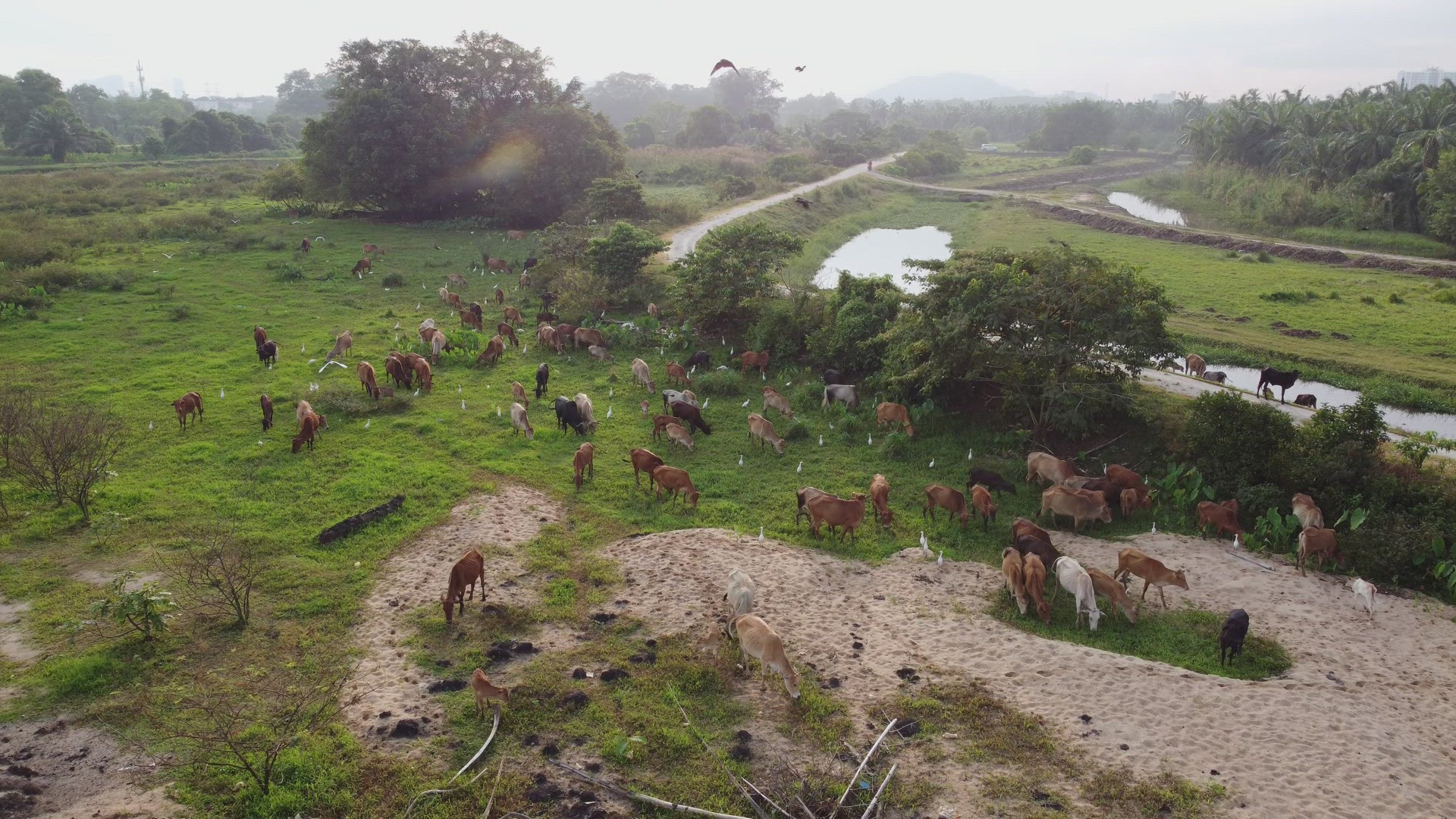 > Herd of cows and egret birds
