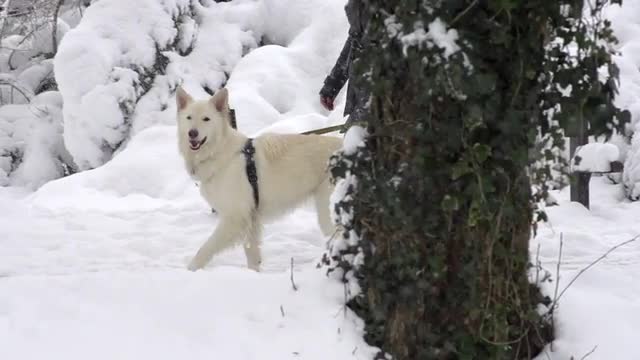 > Slow Motion Rear View Of White Shepherd Dog On The Walk Through Snowy Park