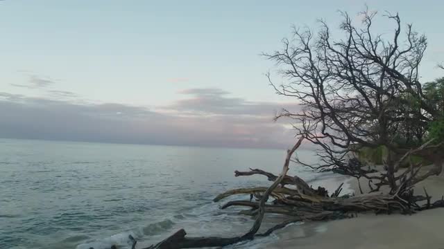 Aerial Flying Over Coastal Green Trees To Reveal Low Tide Beach Beside Pacific Ocean Waters