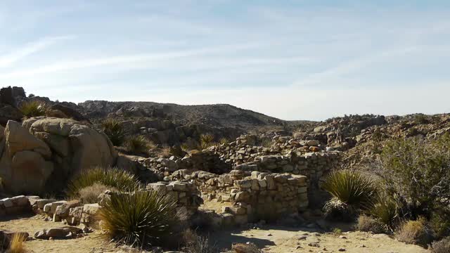 Aerial footage of a beautiful rock face with morning light and joshua trees at it's base.