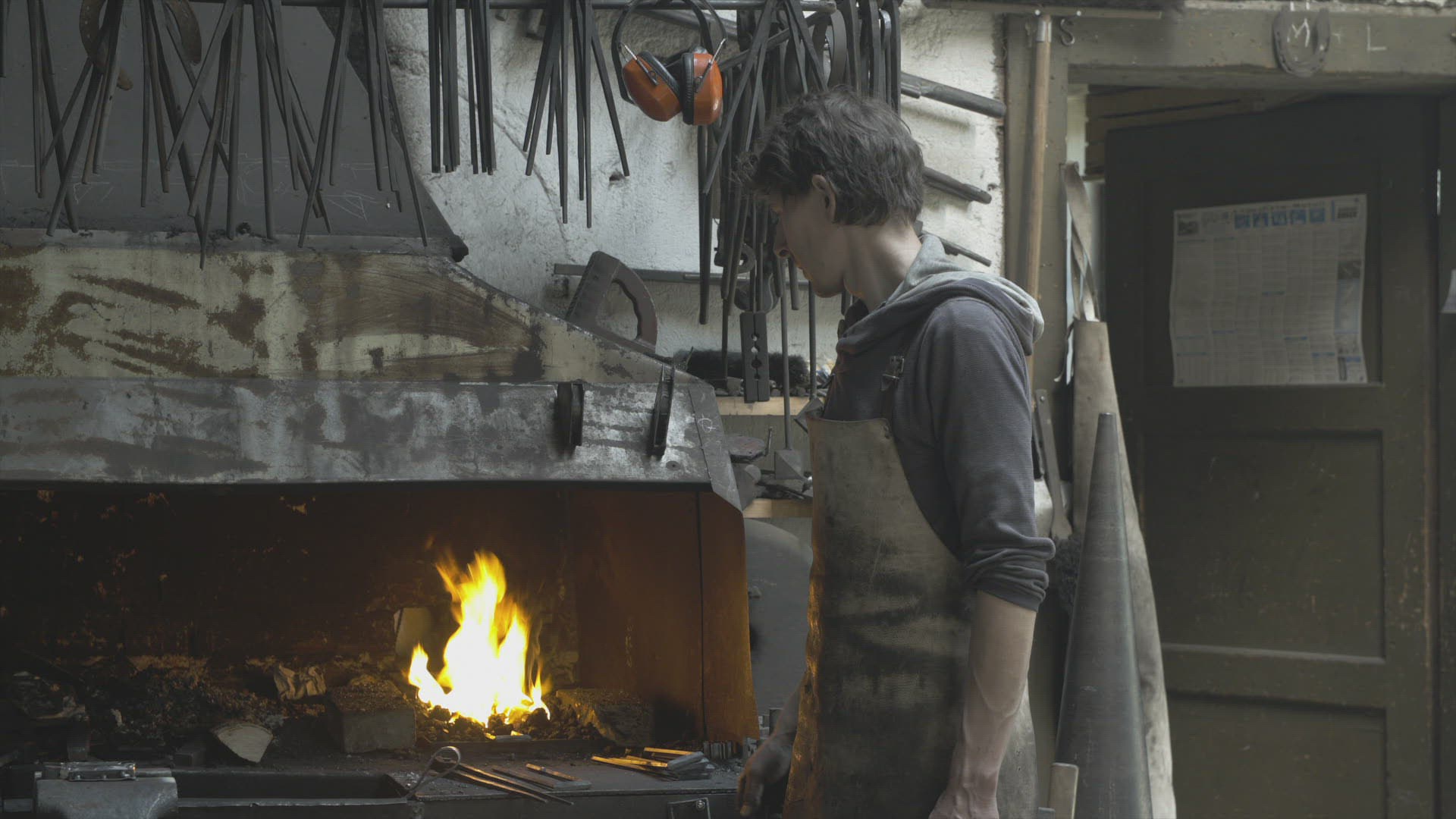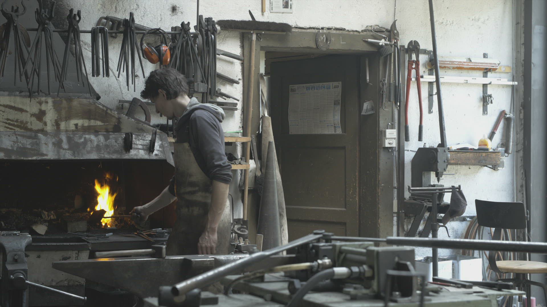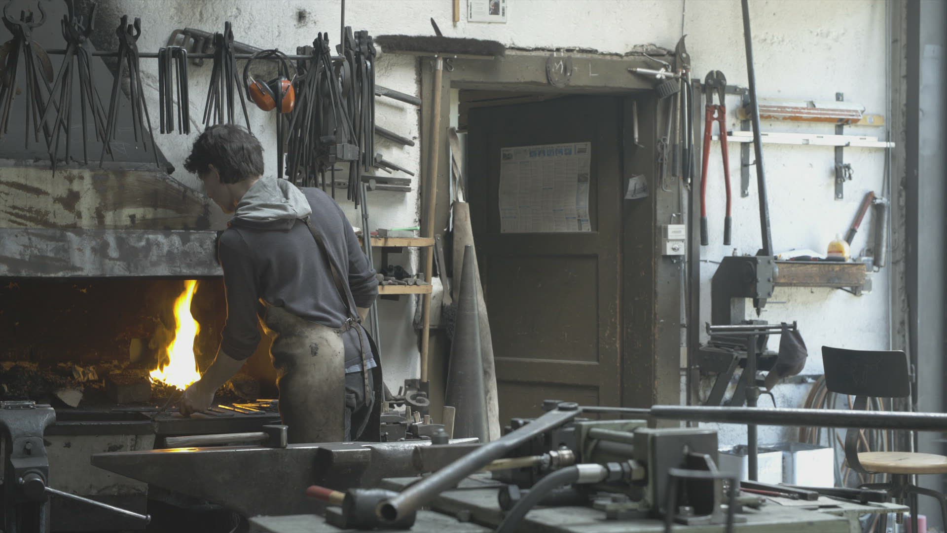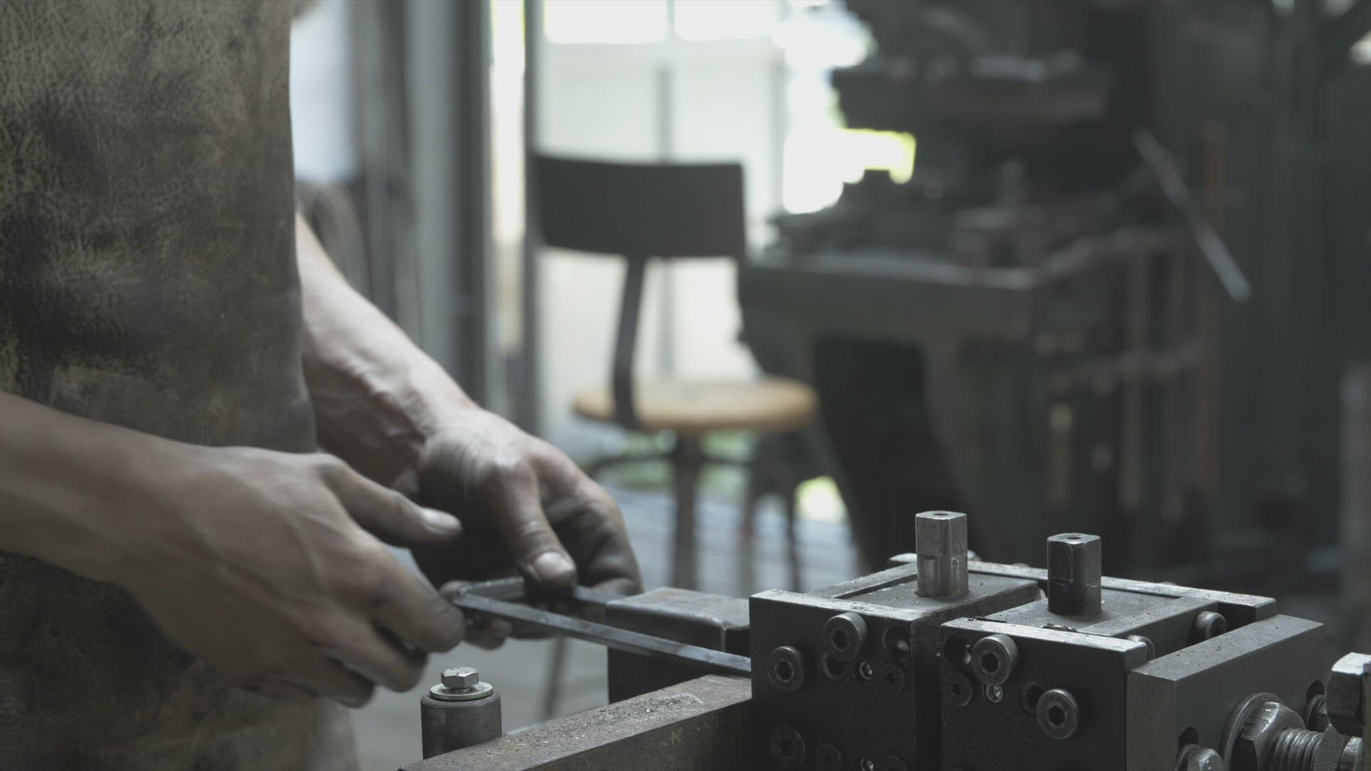 Static shot of a grinding process in factory. Large wheel and grinder rotating. Slow motion 25perc. 4k.