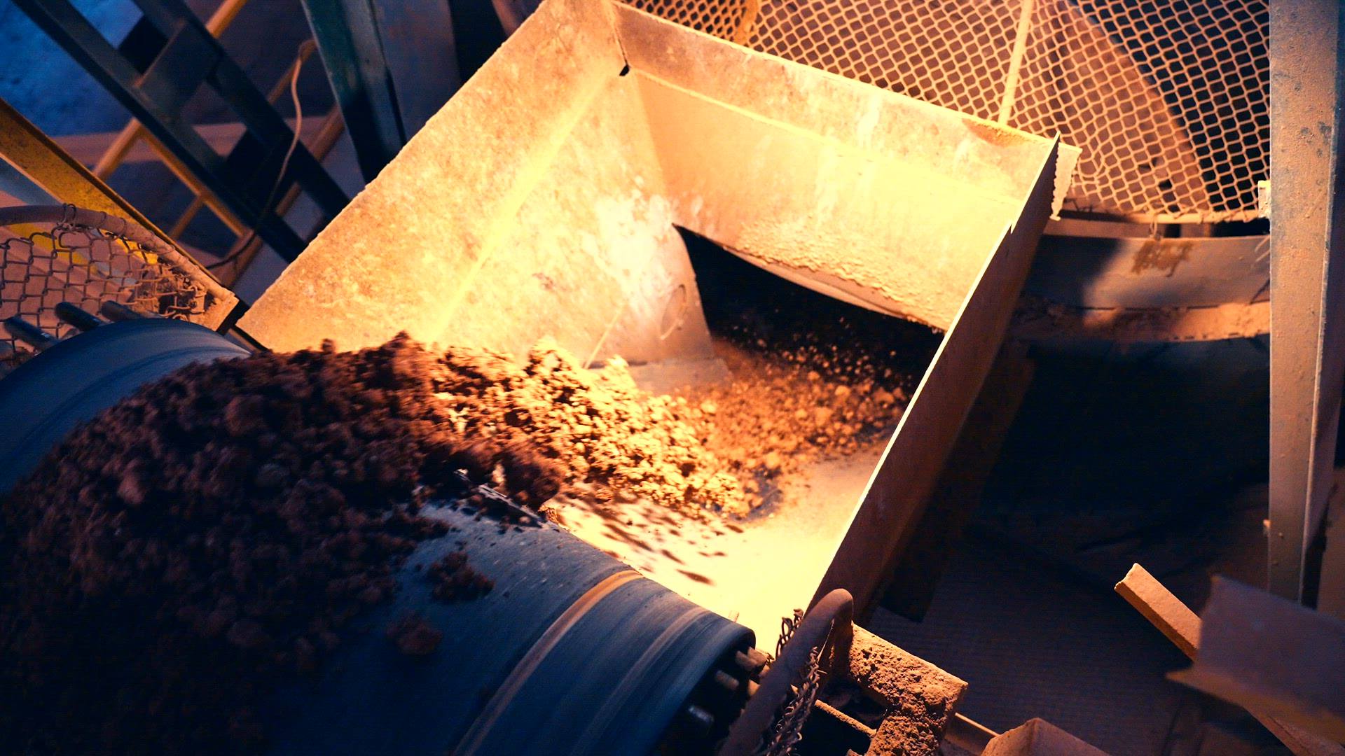 Static shot of industrial pressure rollers in action. Clay stones being mashed in slow motion 25perc. 4k.