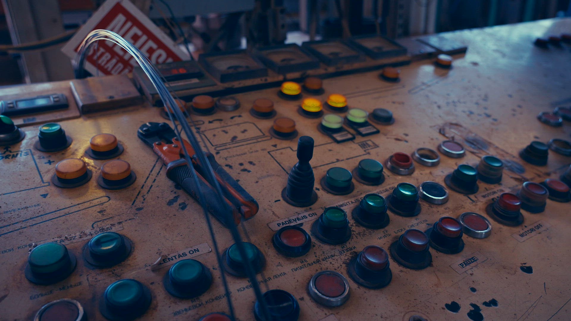 Handheld following shot of a workers finger pushing factory console buttons. Factory being switched on. 4k.