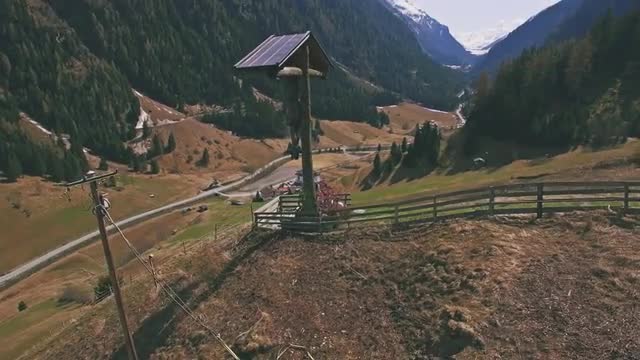 Aerial view starting with blue water river and revealing beautiful waterfall and forest in background. Tirol, Austria