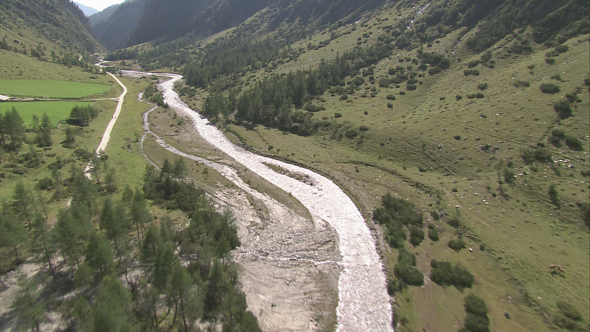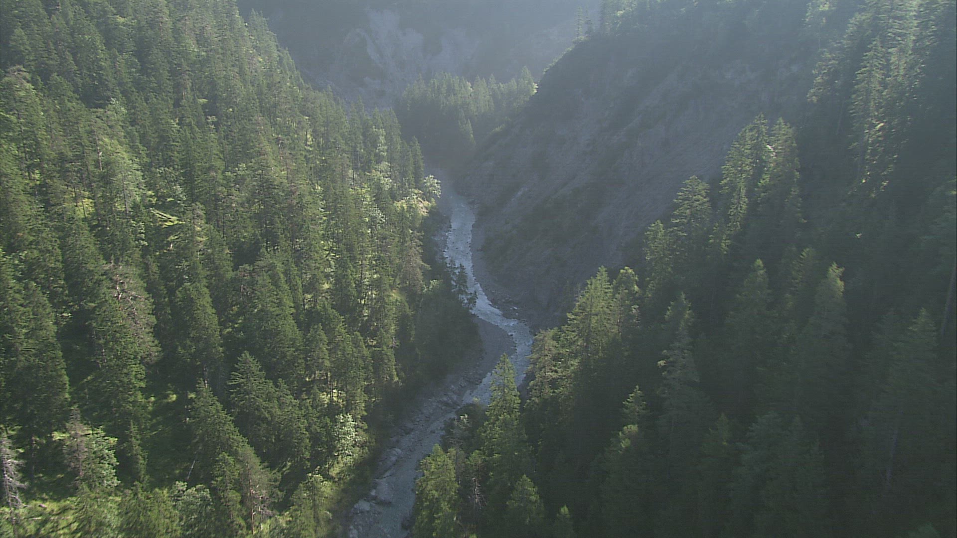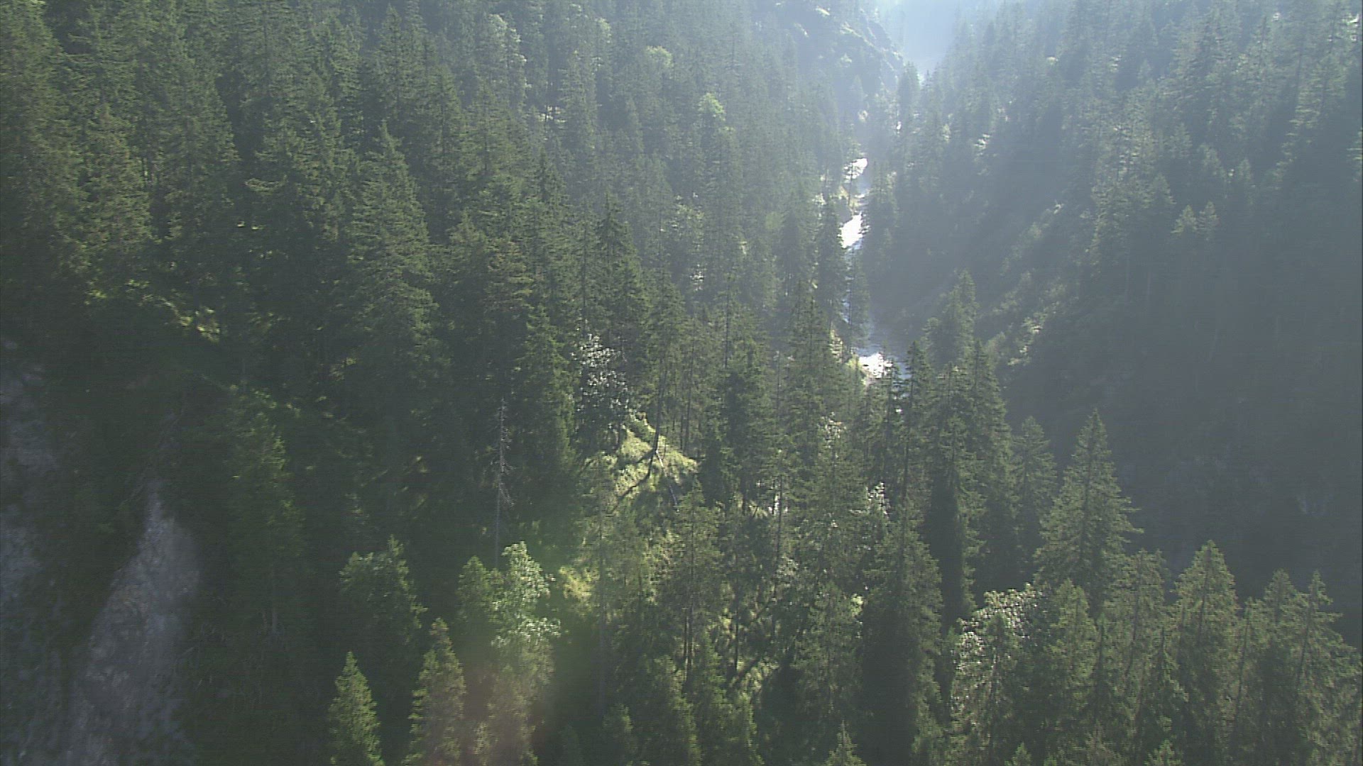 > Aerial footage apline valley with river, pine tree forest and waterfall. Tirol, Austria