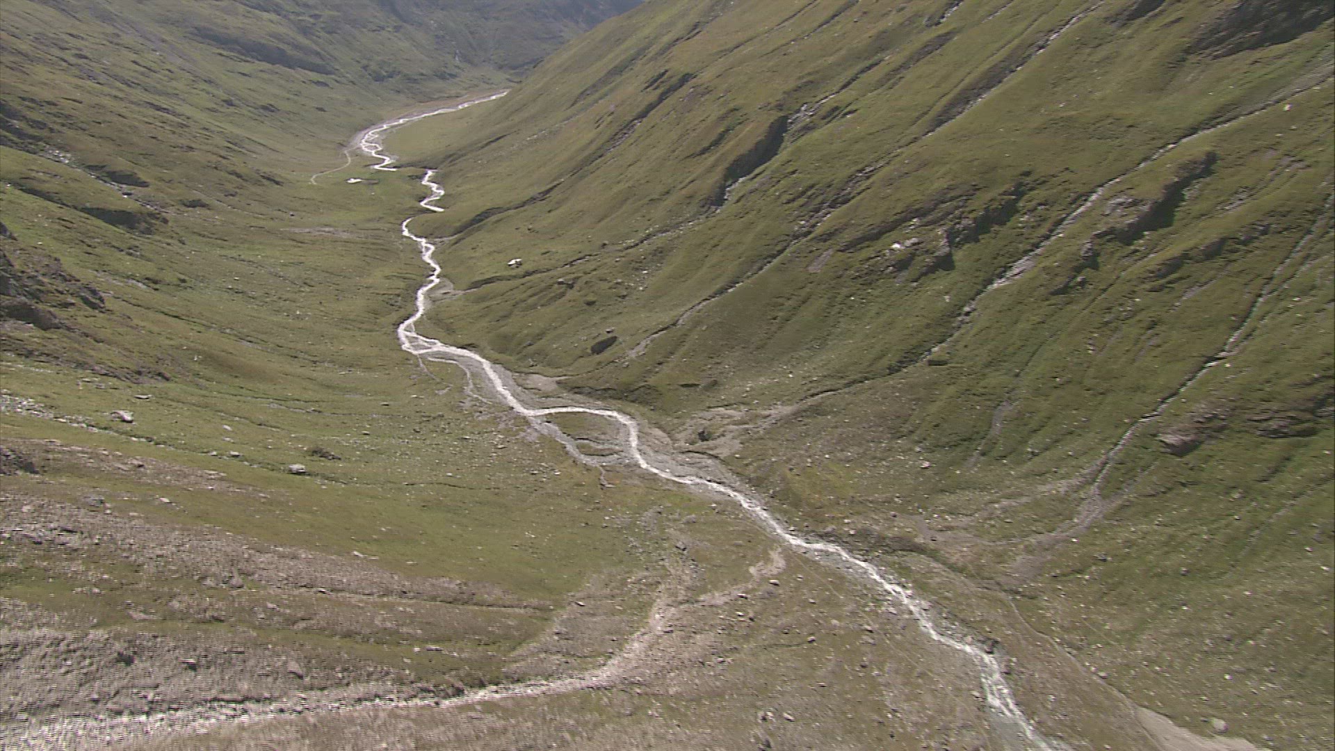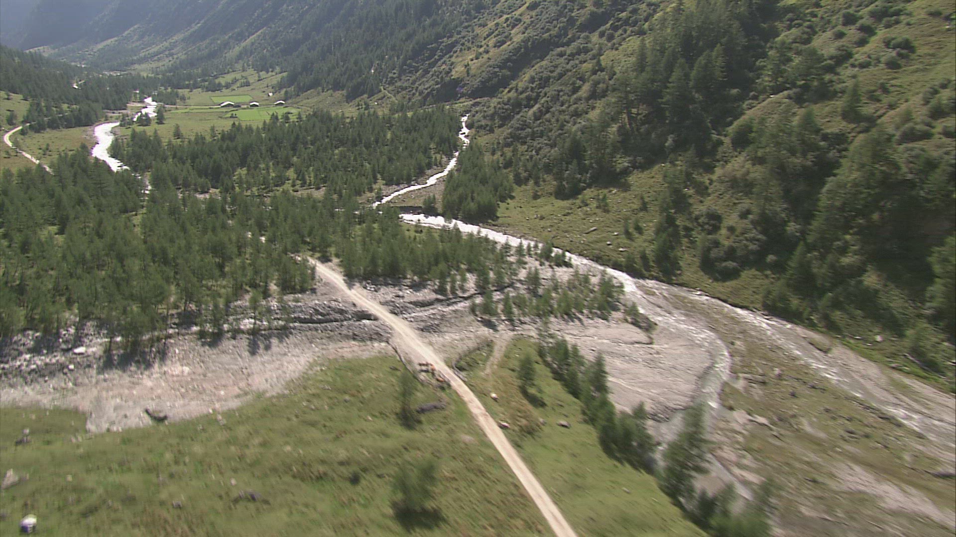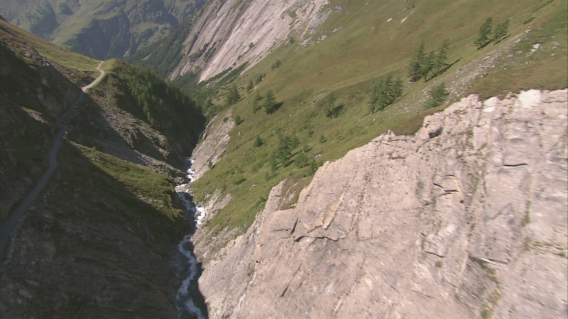 > Aerial footage apline valley with river, pine tree forest and waterfall. Tirol, Austria