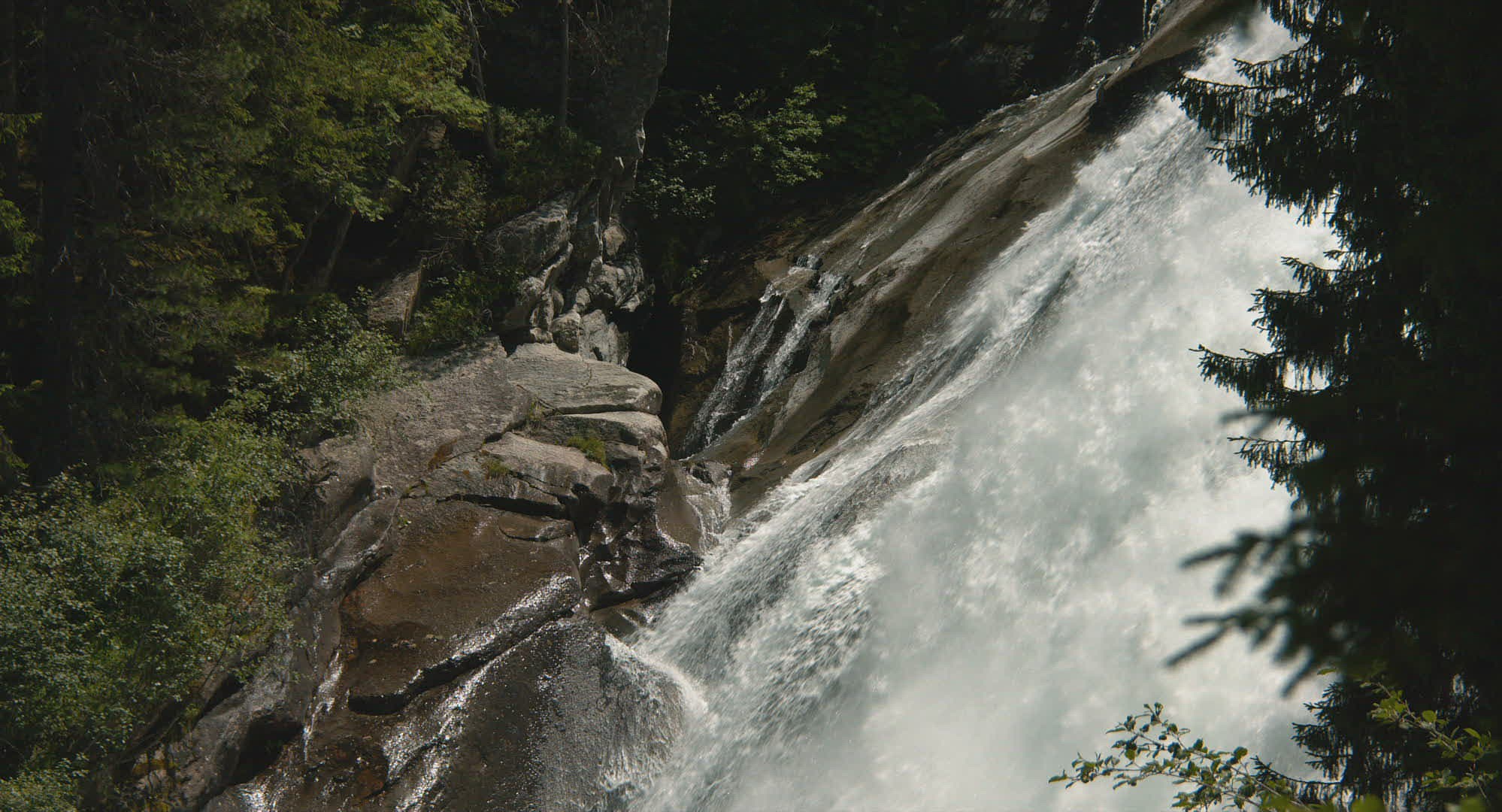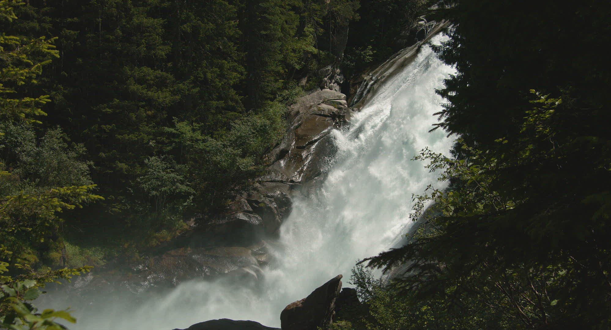 > Austria, Tirol. Aerial fly towards mountain waterfall Krimml most famous outdoor hiking tourism dest