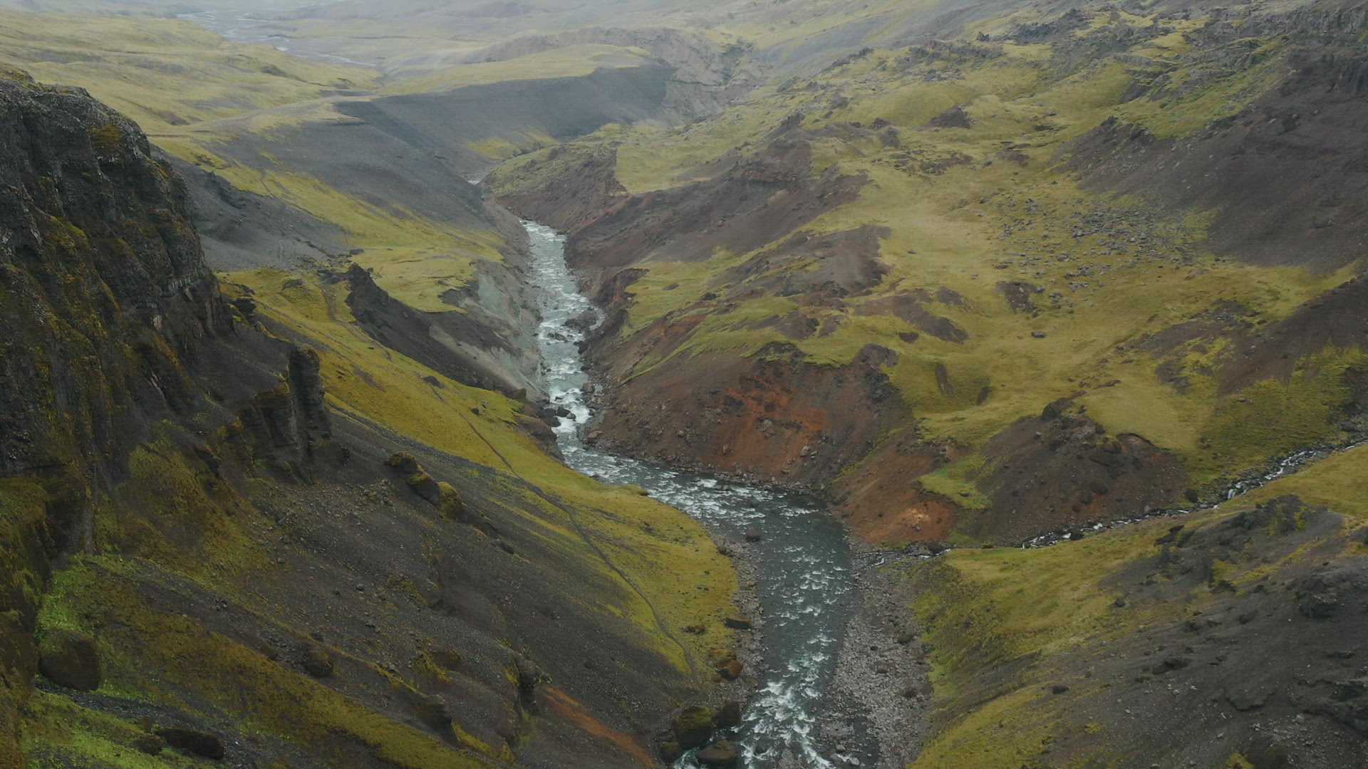 > Aerial drone footage of Fossa river, Iceland's longest river. View over the canyon.