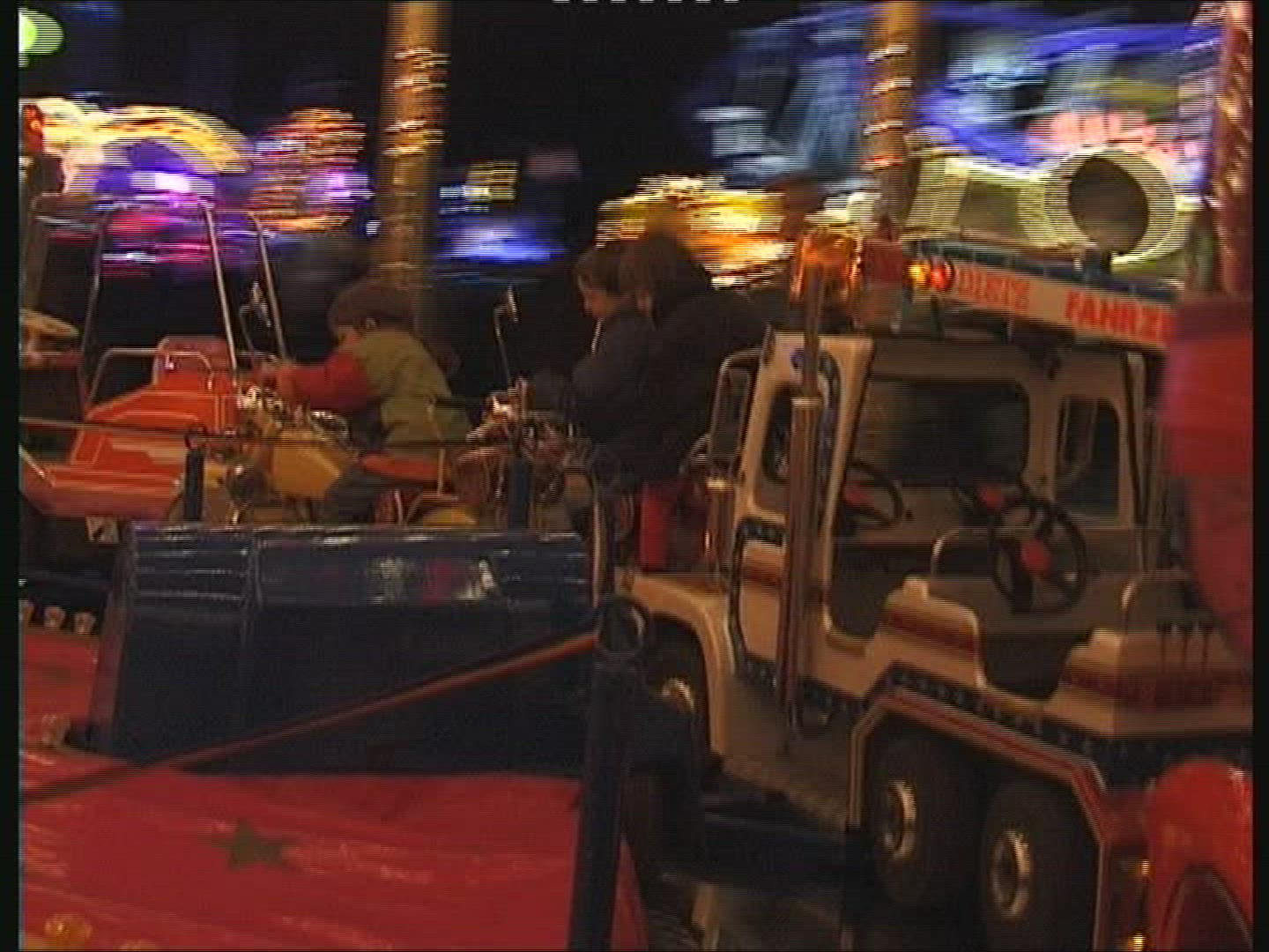 Excited little girl having fun in outdoor amusement park and riding on merry-go-round, view from inside the moving cart
