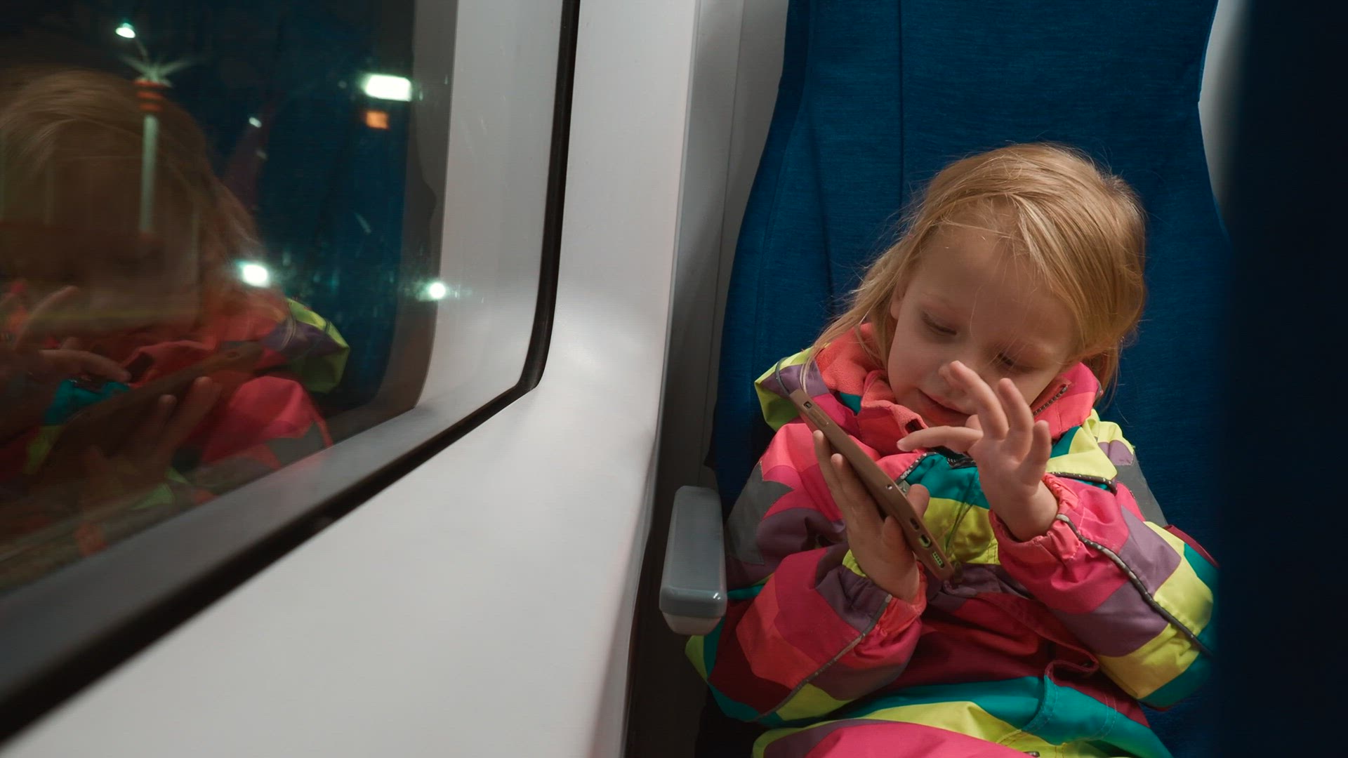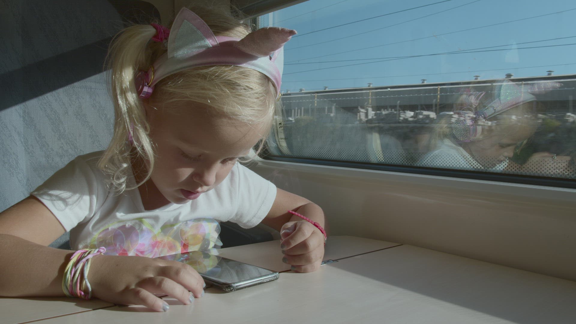 Lovely little girl in cute pink headphones being attracted with mobile video or cartoon while train passing through the hilled country