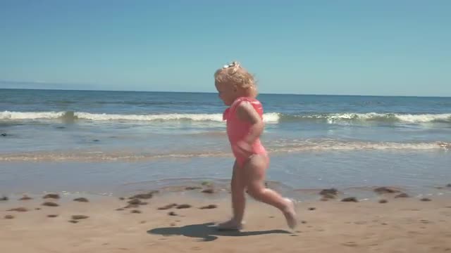 Slow motion front shot of a cheerful little girl running on the beach against sea background. Delighted child with fair hair and blue eyes. Happy childhood