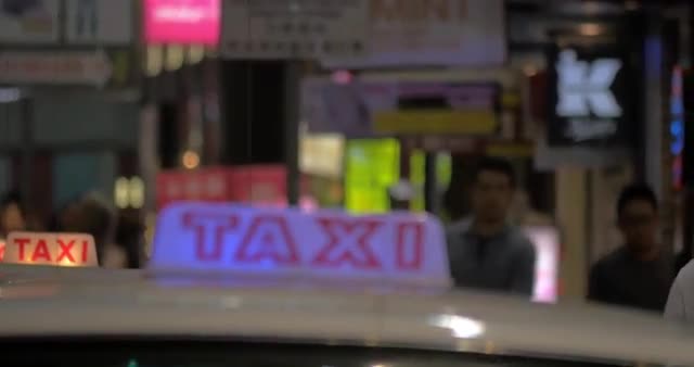 MADRID, SPAIN - MAY 07, 2022: Transport traffic in city street. Taxi vehicles, cars and bicycles on the narrow road. People walking along the sidewalk with store banners