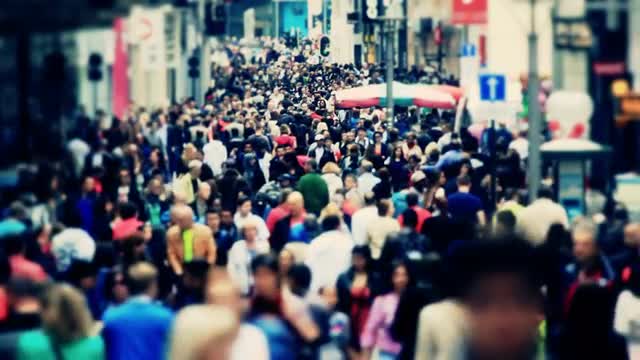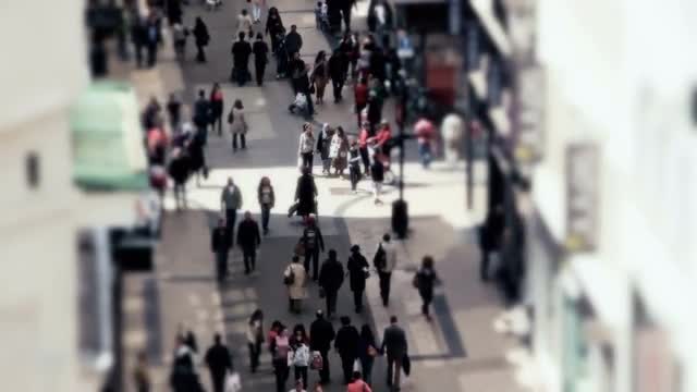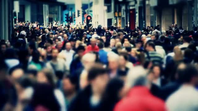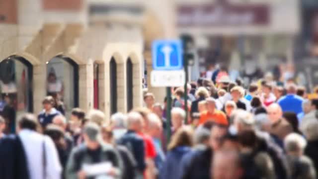 Lively street in Europe. A lot of unidentified people walking in alleyway, view in sunlight with flecks