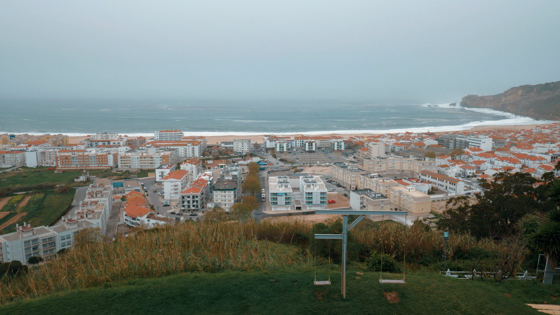 Panning shot of Nazare ocean coast, Portugal. Green farmlands, houses and hotel on beachline. Scenic shore view from the hill with empty swings