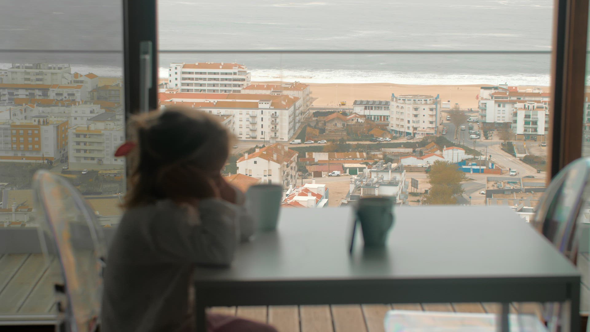 Little girl in pajamas watching cartoons on smartphone while waiting for breakfast. Balcony overlooking beachline with houses and ocean. Shot with changing focus