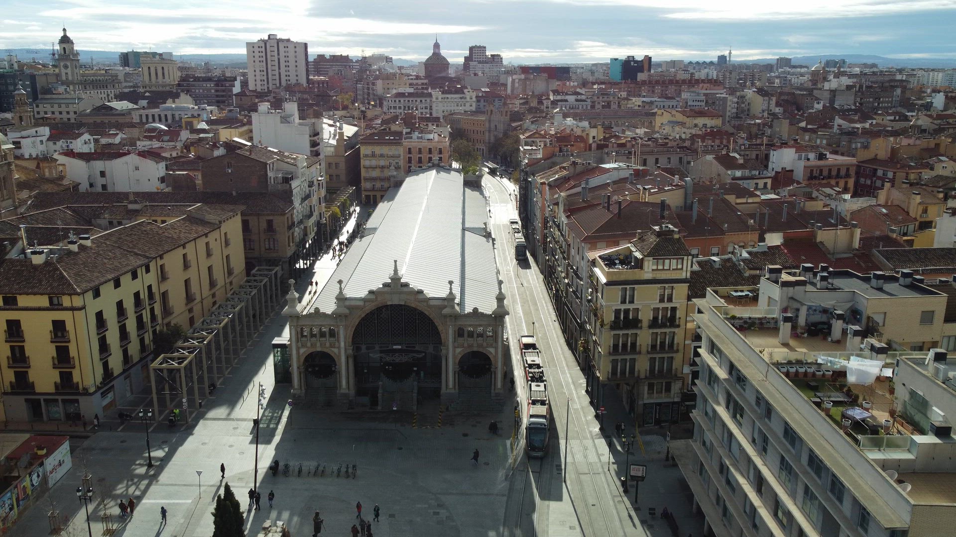 Aerial city view of Zaragoza with Central Market, Spain
