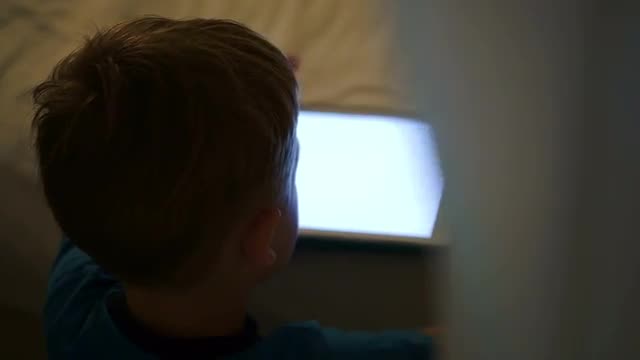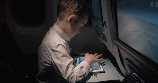 Little girl traveling by plane and sitting by the window. Child spending time with digital tablet to draw and play games not to be bored during the flight. Comfortable air travel