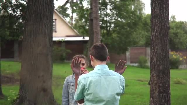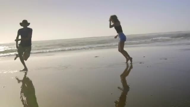 Steadicam shot of older brother in a green jumper holds the hand of his younger sister, dressed in a jacket with a hood, while walking along the sandy beach, along the sea, talking about something and laughing