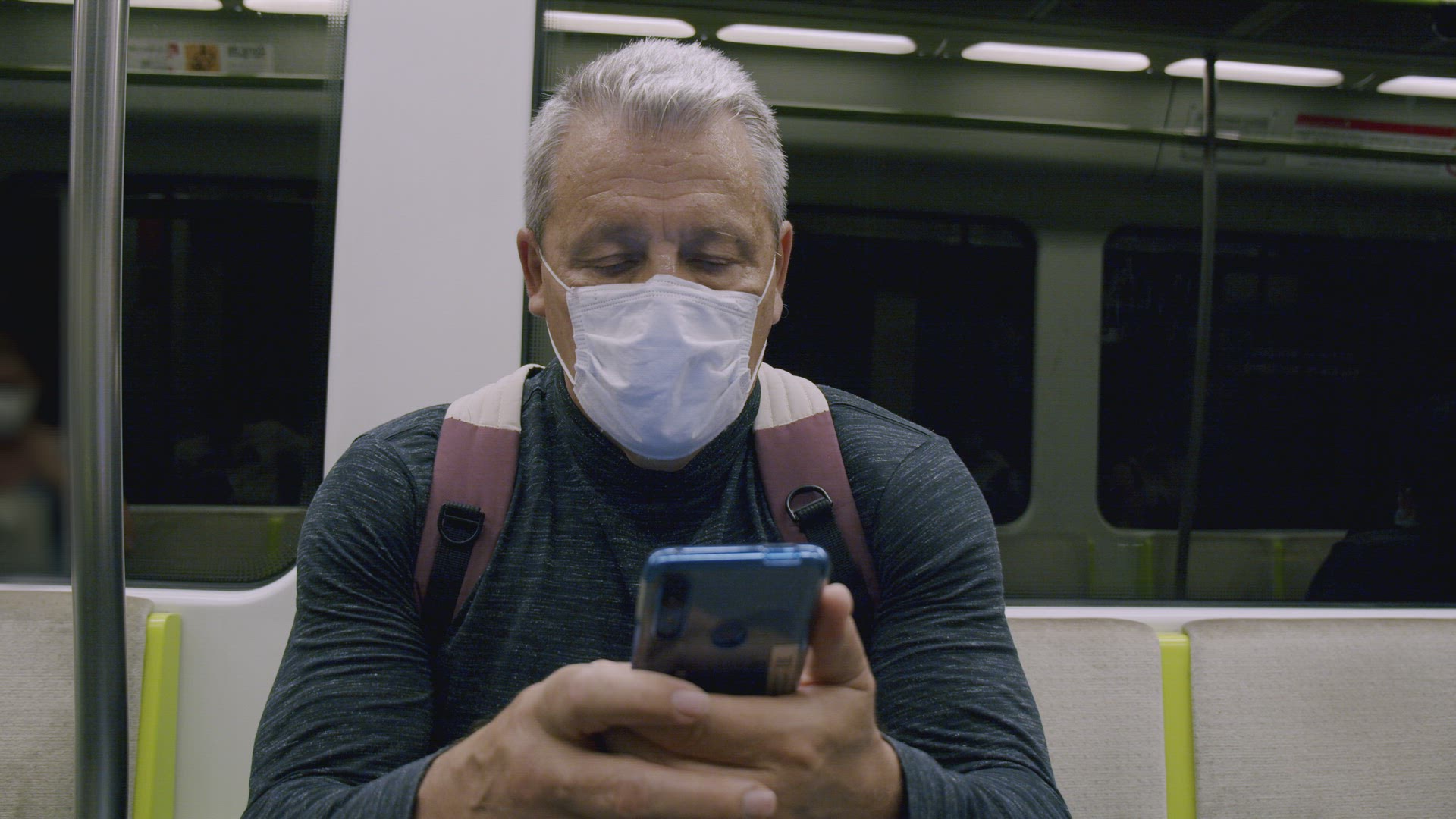 Medium shot - an old gray-haired Caucasian man in a protective mask, riding in a subway train car, holding a smartphone in his hands and typing