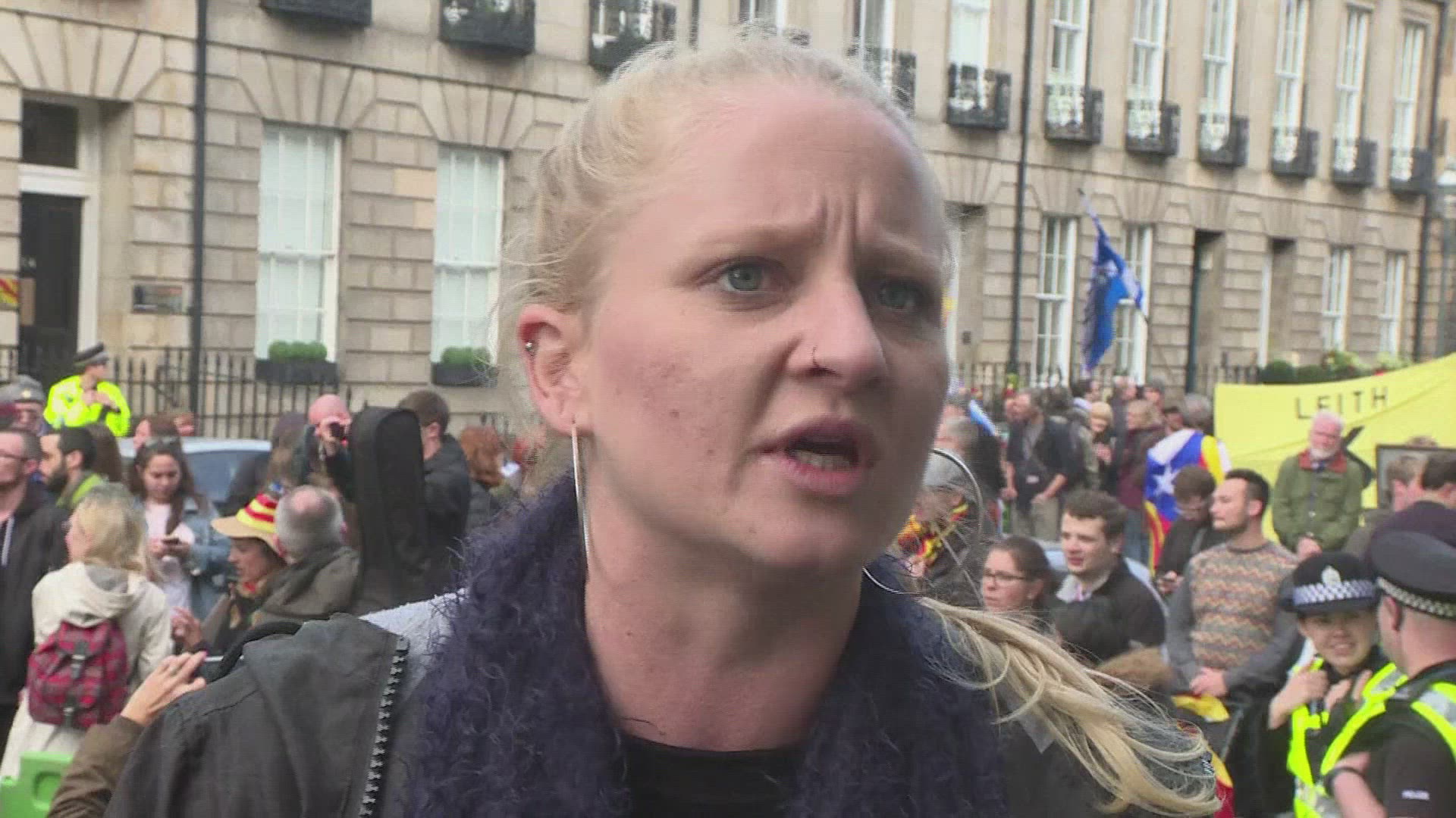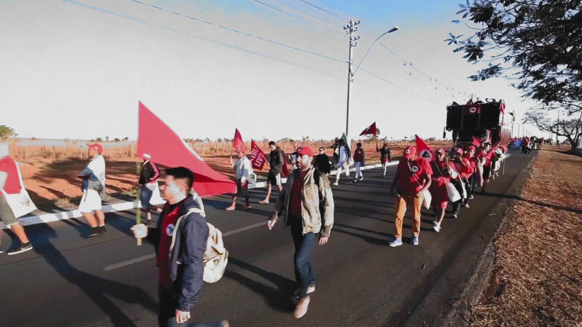 VALENCIA, SPAIN - OCTOBER 12, 2021: Crowd of young people representing Communist party marching along the street with red flag of their party under policemen supervision, Independence Day