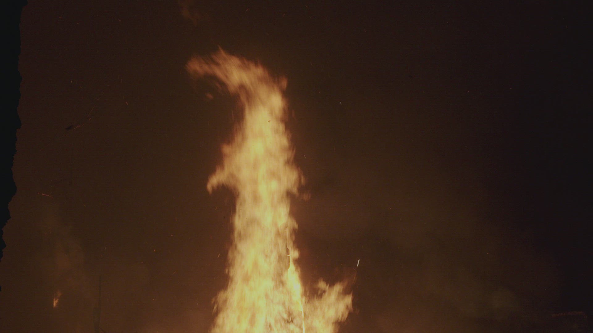 Slow motion, The last night of the festival in Valencia, Spain, huge flames light up the black sky, clouds of smoke envelop the streets, Fallas, Valencia, Spain