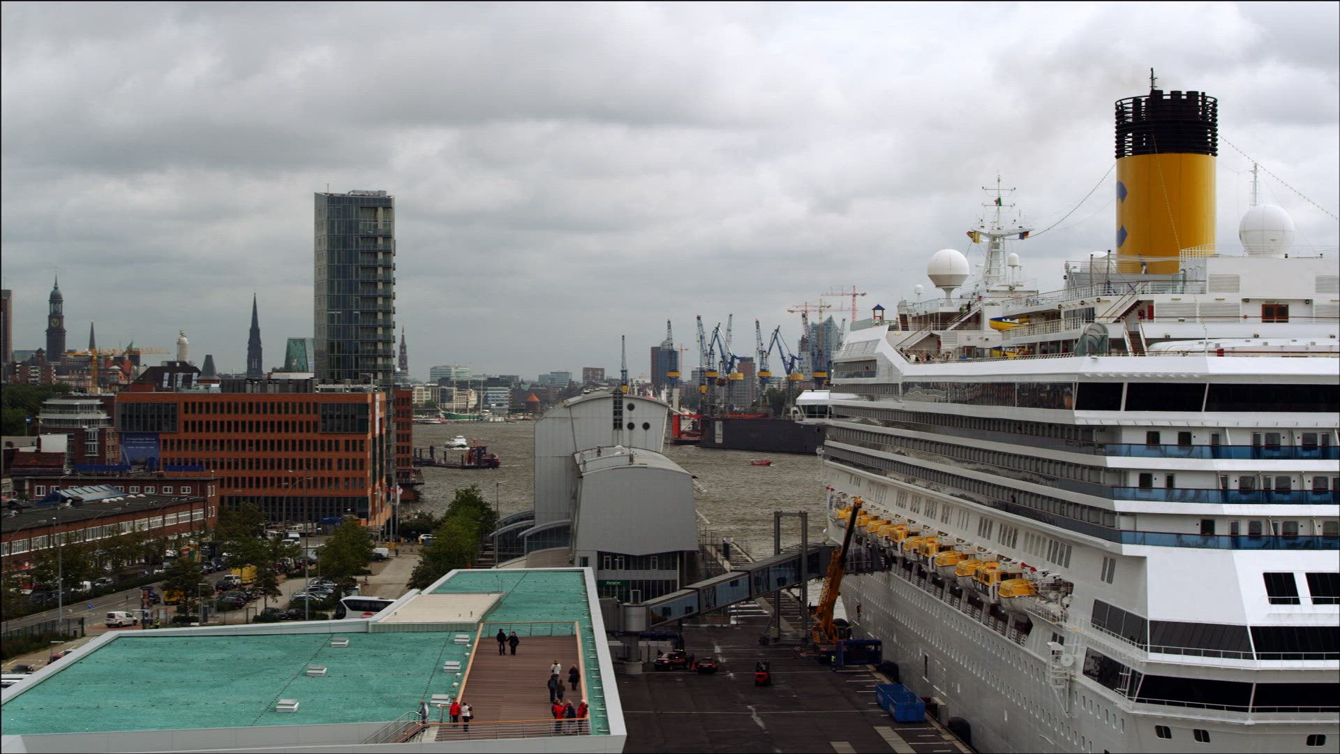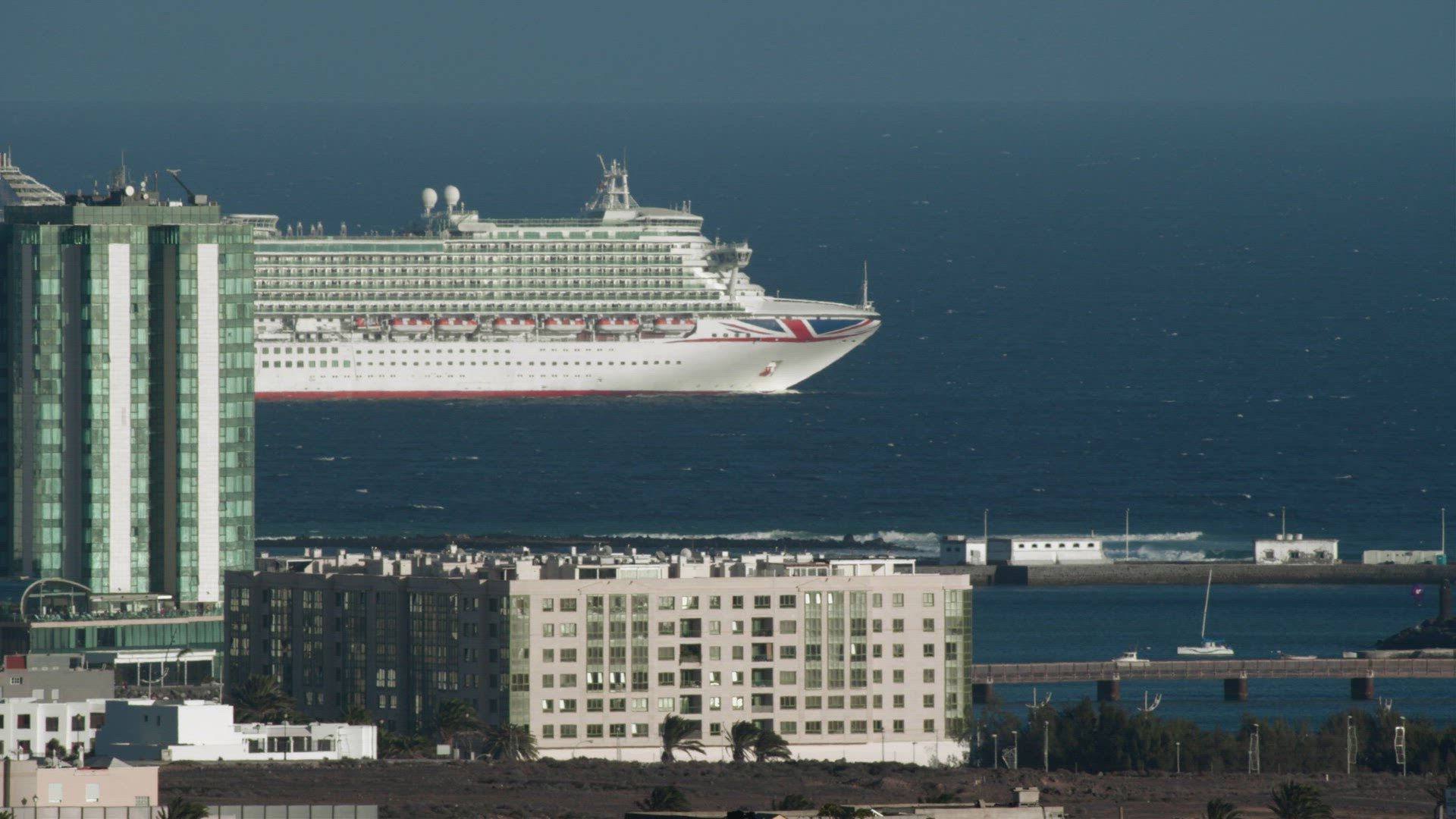 Long shot - a large sea cruise liner, against the background of a blue cloudless sky and an azure sea, enters the water area of the port, passing by multi-storey modern buildings