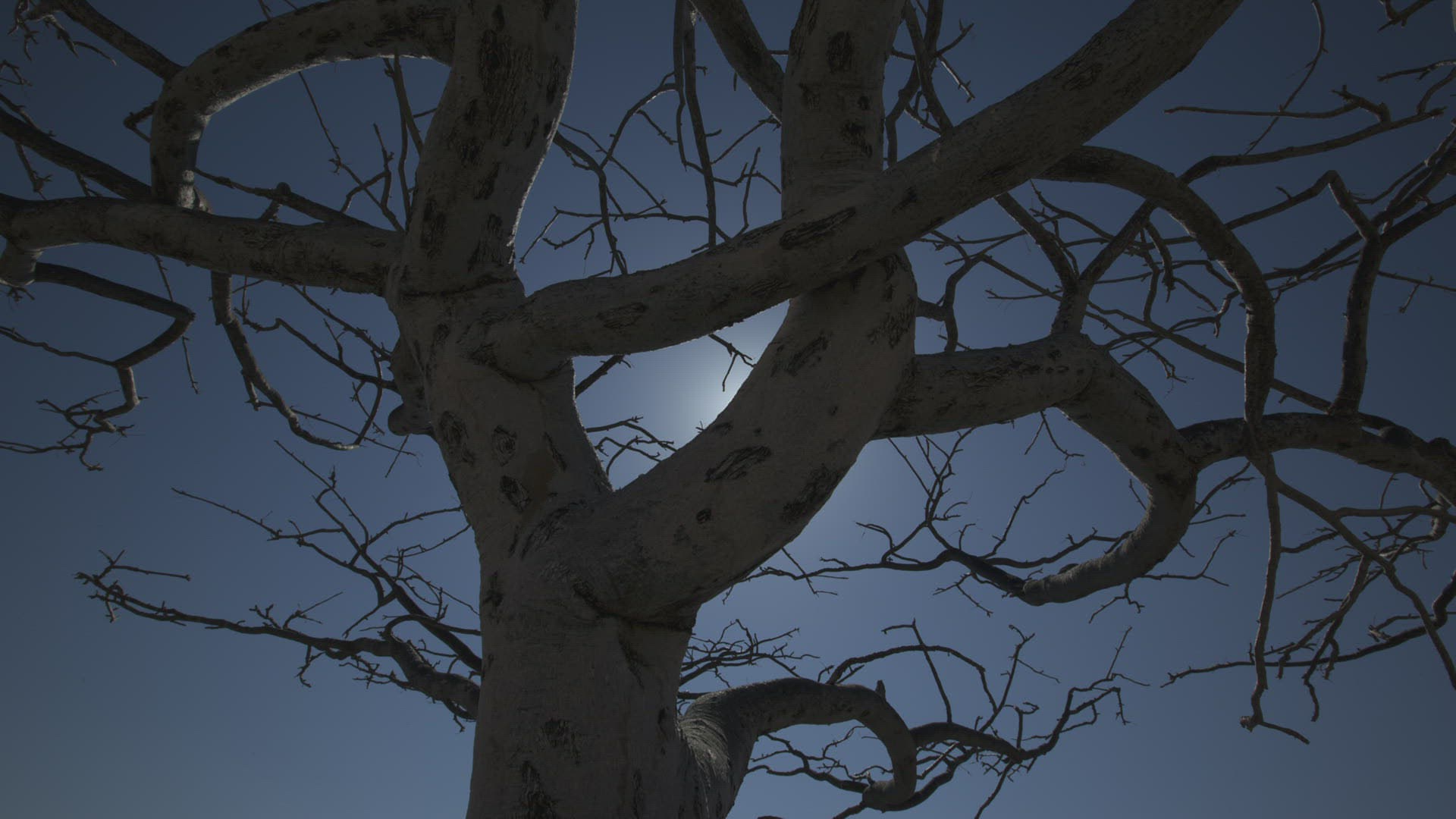 Through the crowns of trees without leaves, against the background of a gray sky, multi-storey residential buildings are visible
