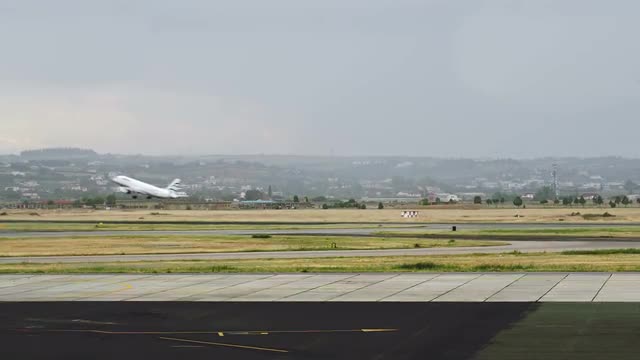 Frontal view - a passenger plane lands on a runway starting off the coastline