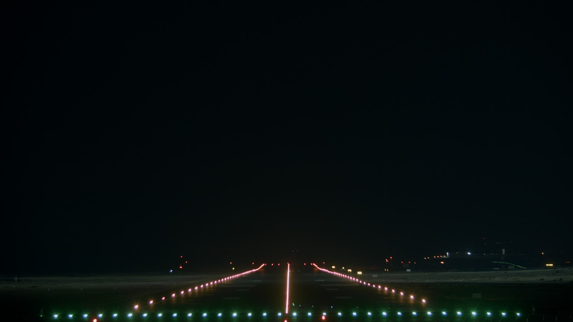 Frontal view - the plane picking up speed, accelerating on the illuminated runway, takes off into the night sky