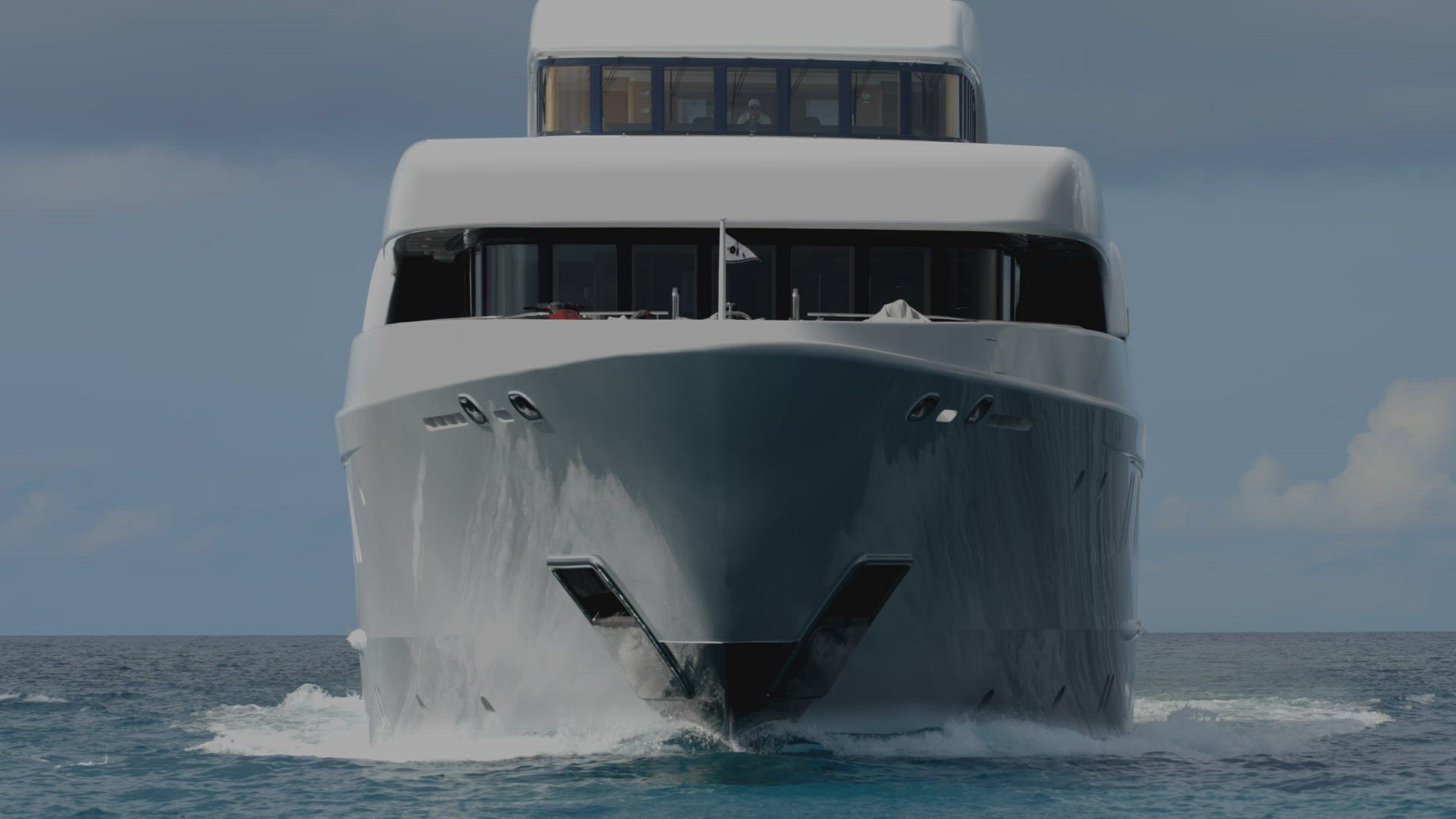 Slow motion frontal low angle shot - the plane flies over the sea, the beach and landing lights located in the sea on high poles