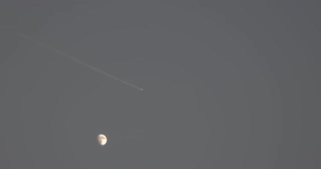 In the red sunset sky, in the background you can see a white trace of an airplane flying into the distance, in the foreground, a luminous lamppost