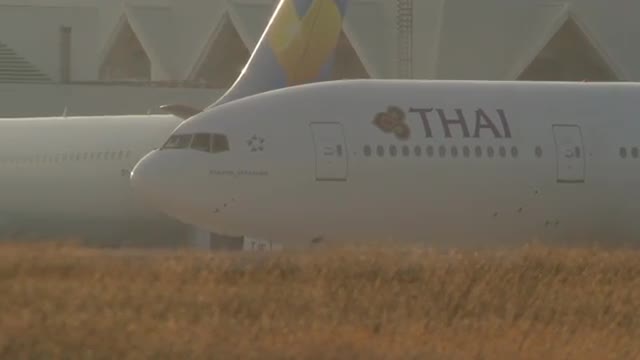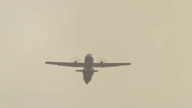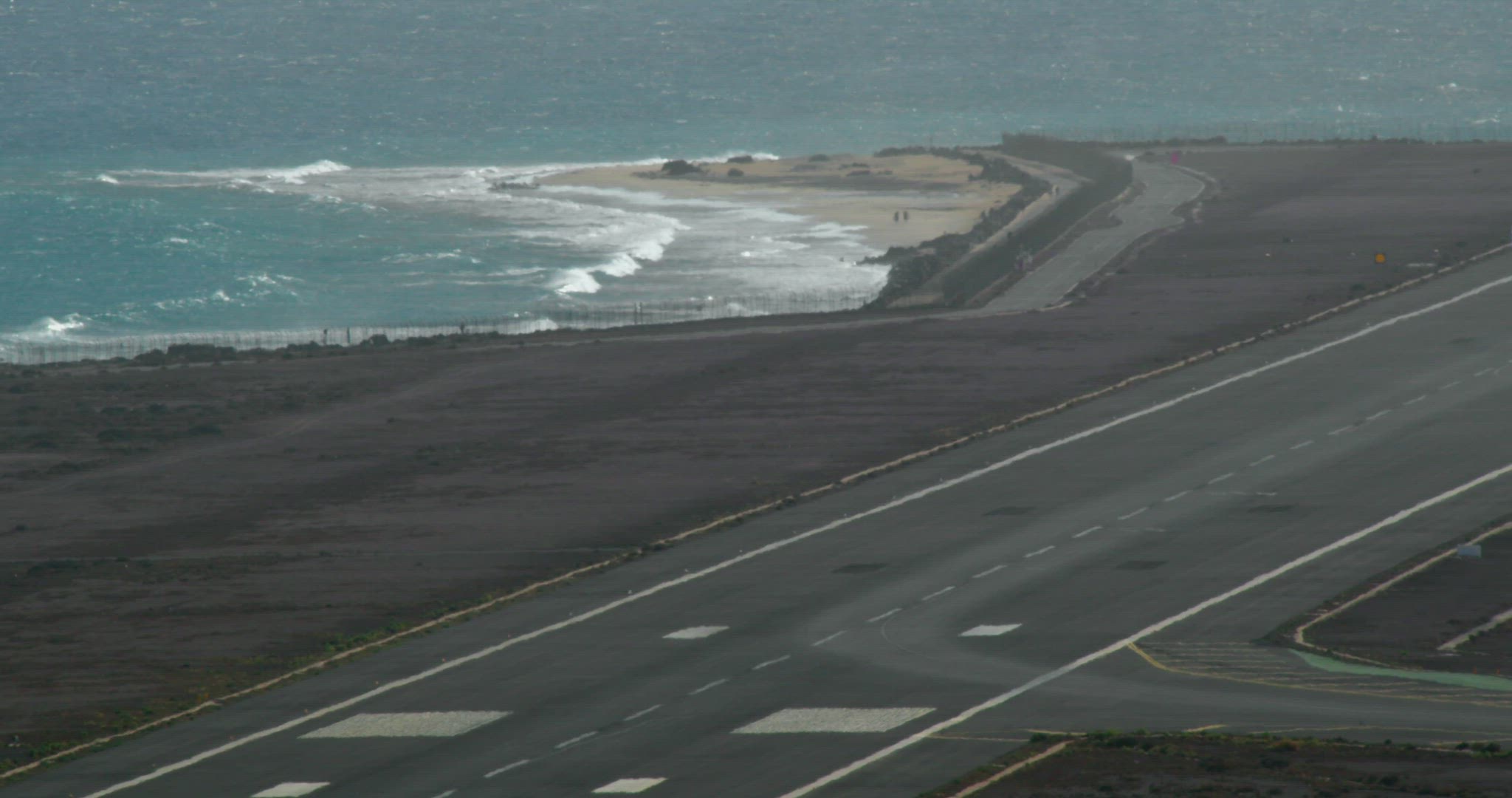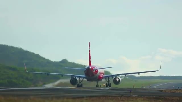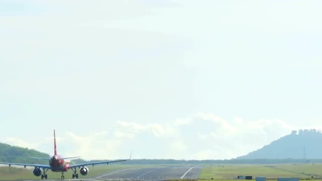 Front view - Passenger aircraft picks up speed, accelerating on a runway located at the sea's edge, and takes off into the sky