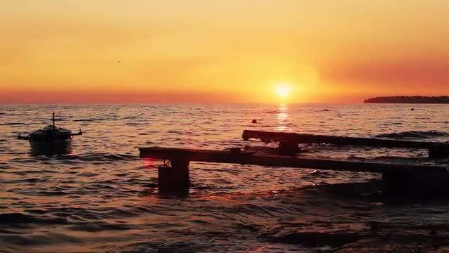 Evening, sea waves slowly roll onto the sandy shore of the beach against the background of the evening sky and the cranes of the seaport visible in the distance