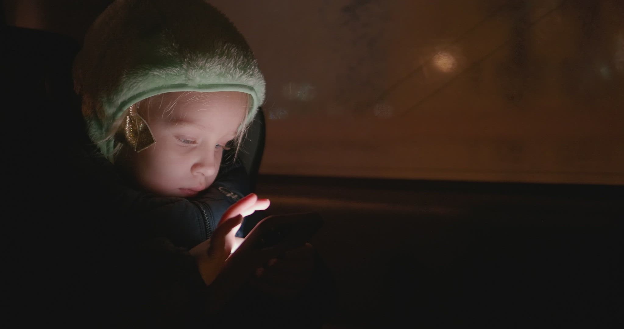 A little girl sits in a car that drives through the streets of the city, near the window, on the back seat, in a child seat, holds a tablet in her hands and plays