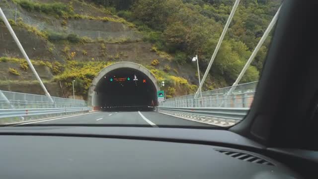 > Car journey along scenic road and driving through the mountain tunnel