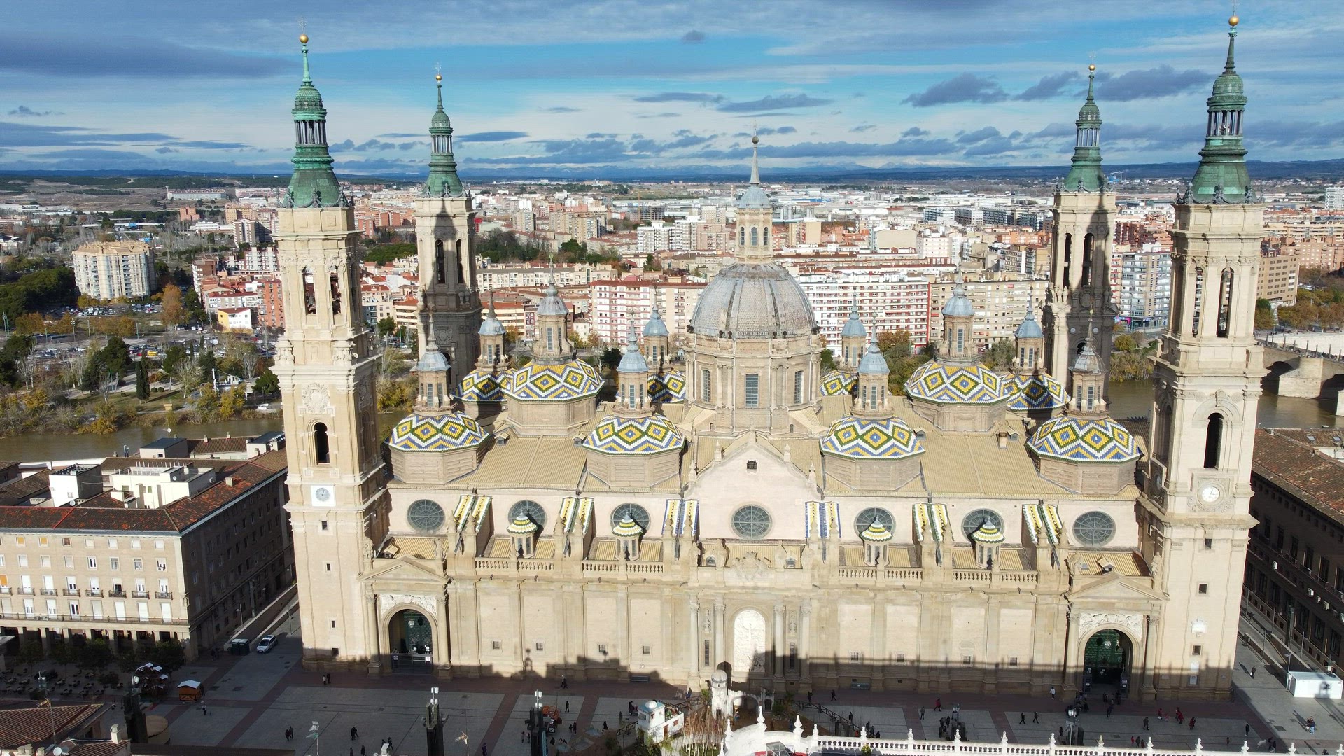 Aerial cityscape of Zaragoza with Cathedral-Basilica of Our Lady of the Pillar and residential areas, Spain. People walking on the square by the cathedral