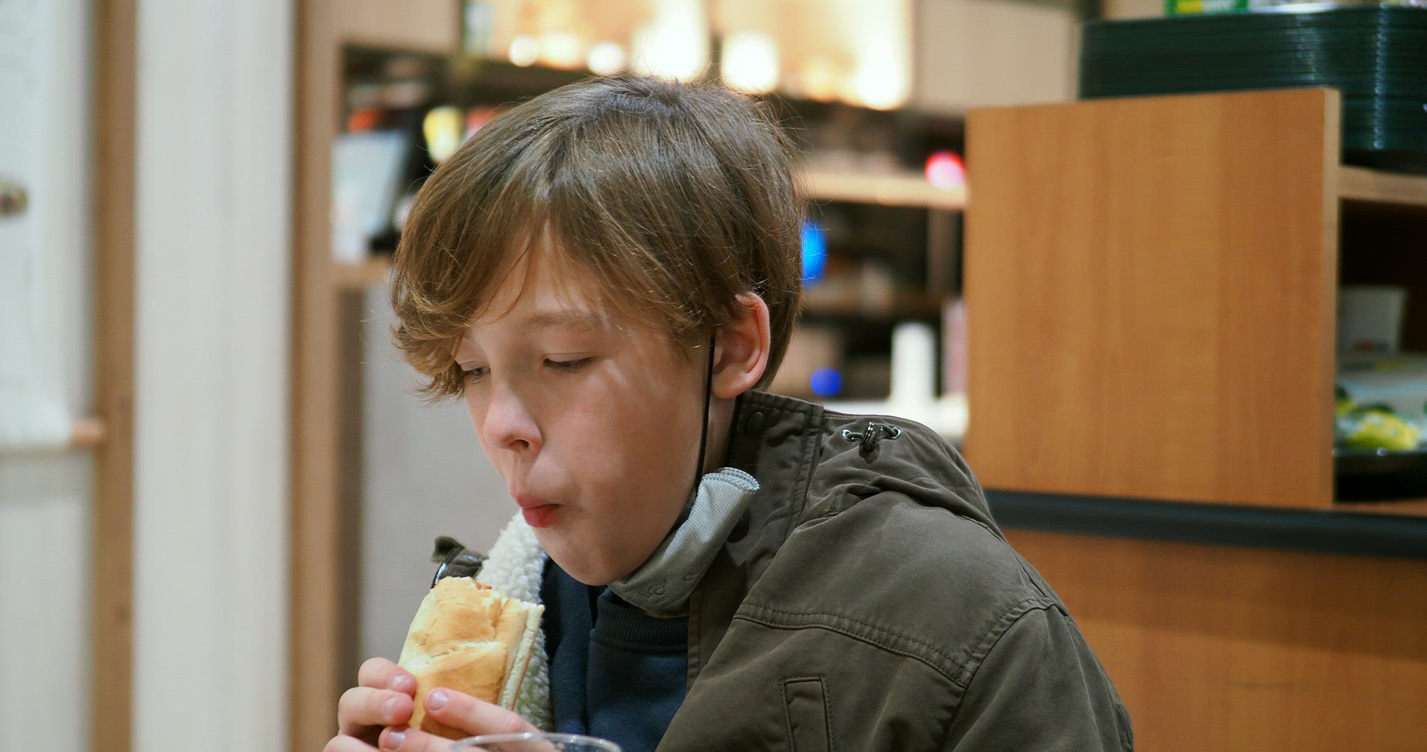 A caucasian boy rides in a bus, looks at something on a mobile phone, the lights of passing cars are visible outside the bus window