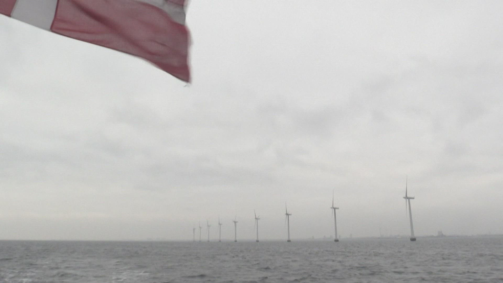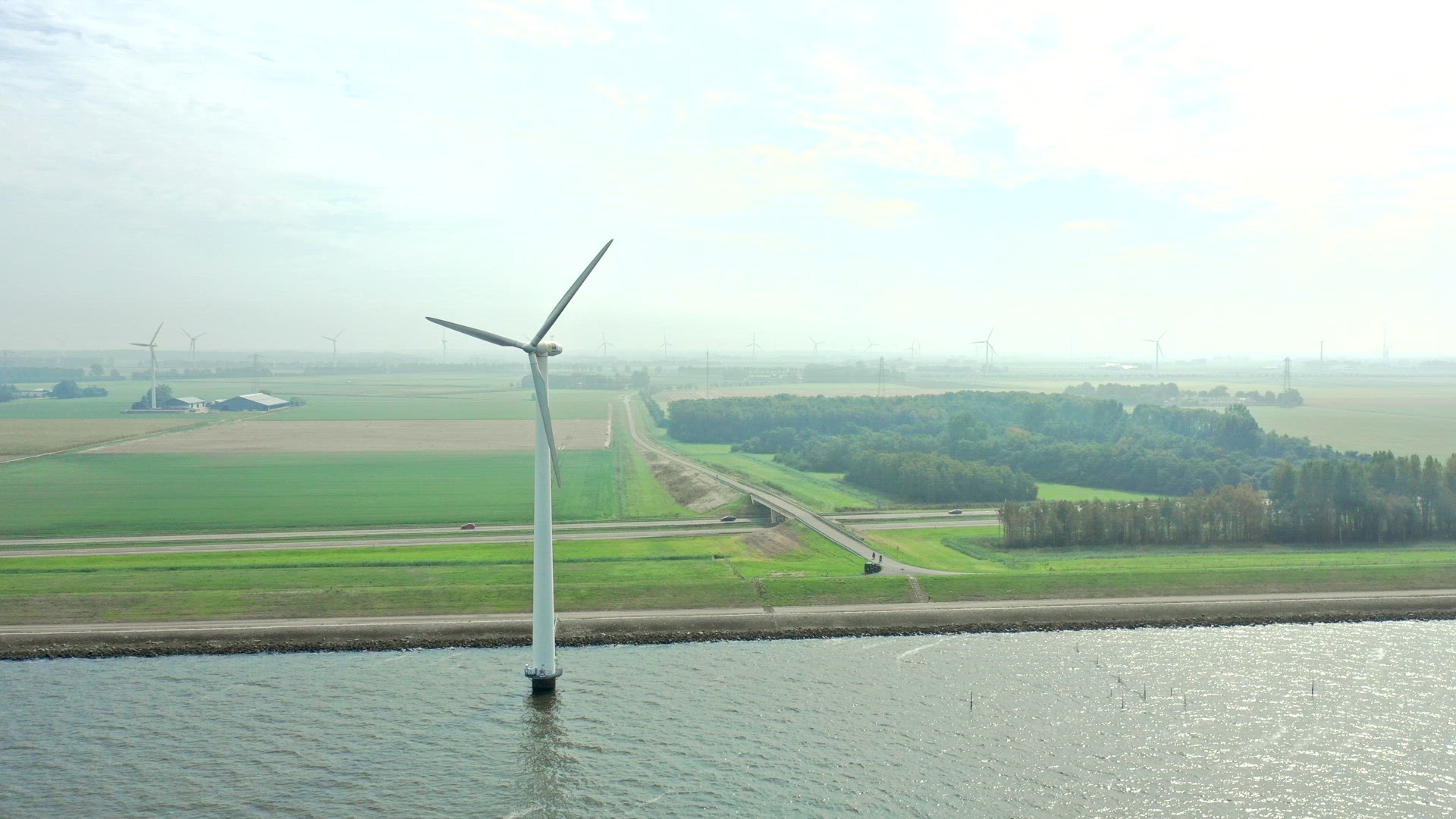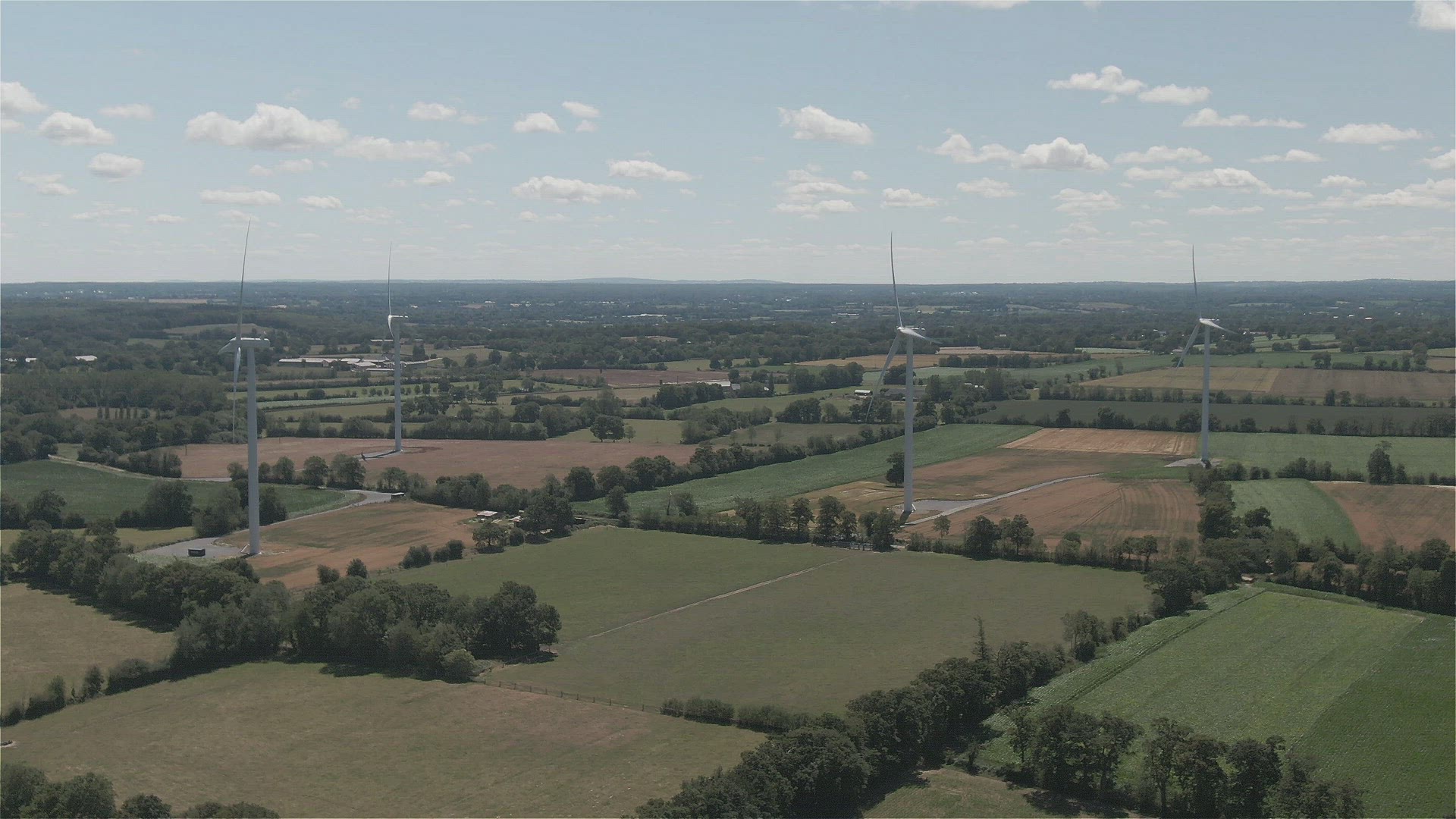 Row of rotating wind turbines in green countryside, view against the sky. Alternative source of energy
