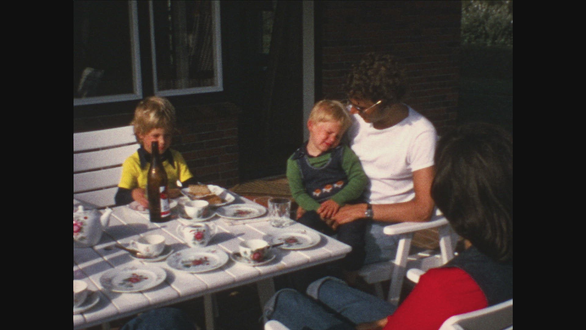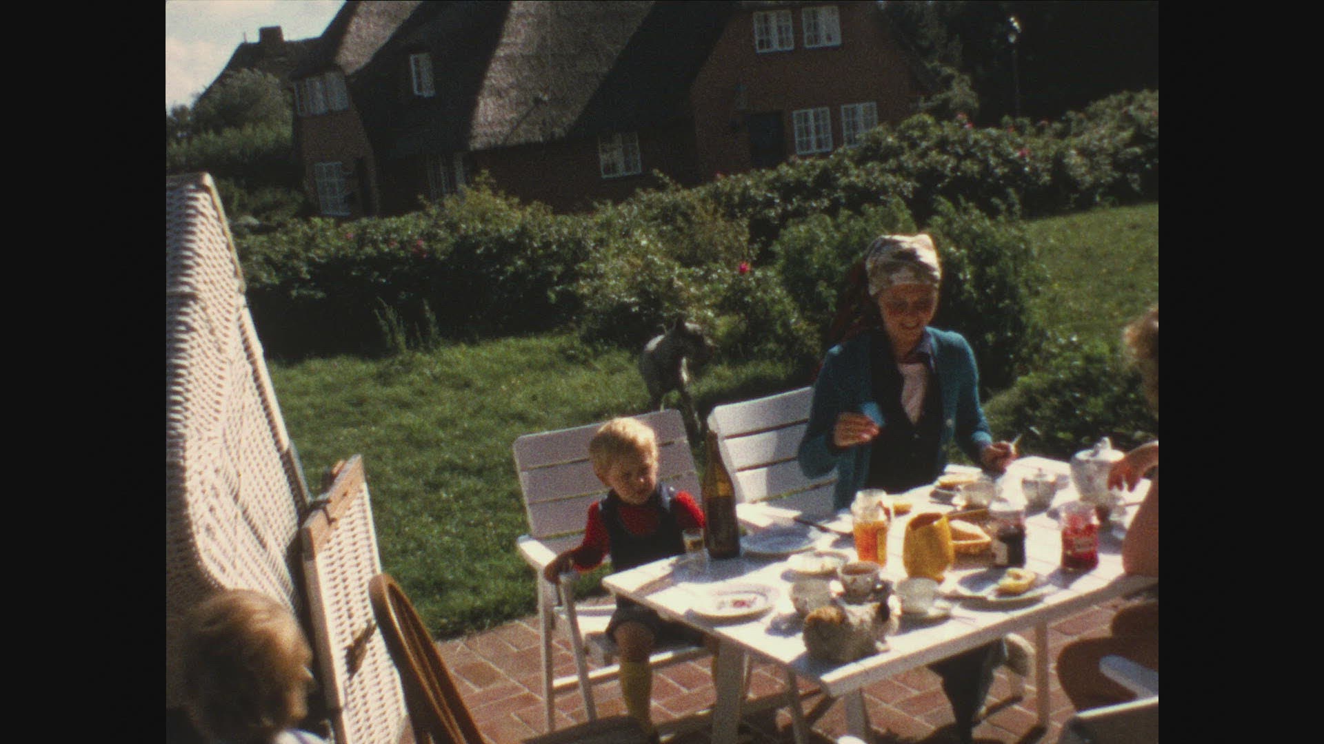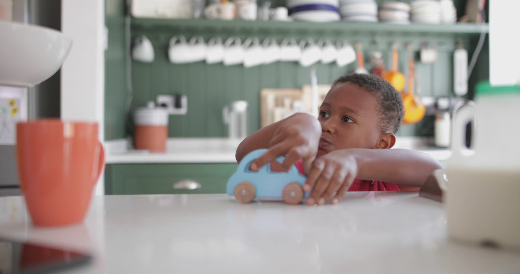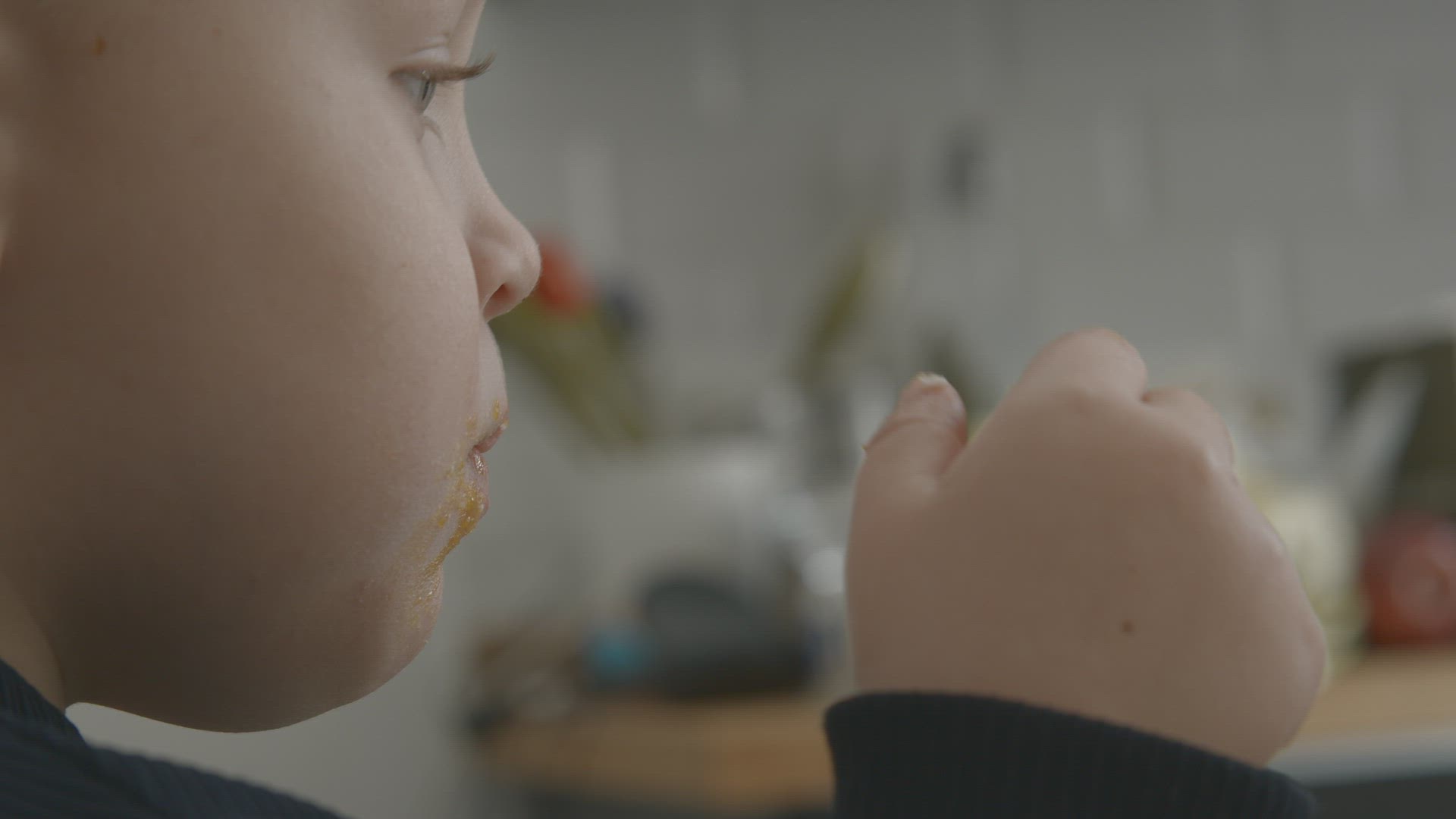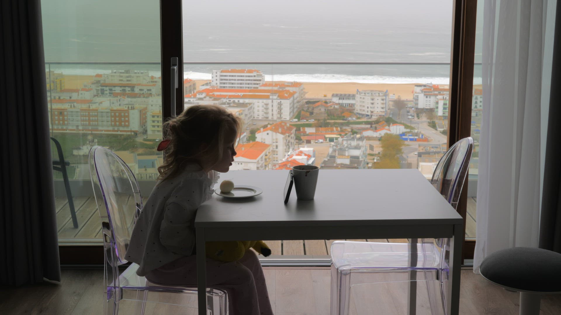 Morning view of the little girl in pajamas and tousled hair watching cartoons on the phone during the breakfast, shot against the open balcony