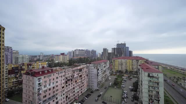 Panoramic view of the modern buildings of the city from the window of an aircraft that has lowered its altitude while landing