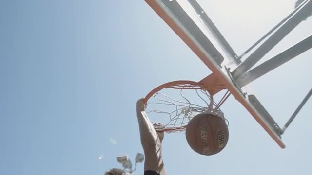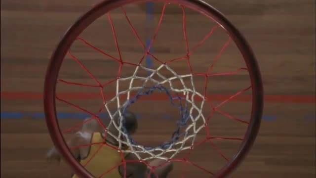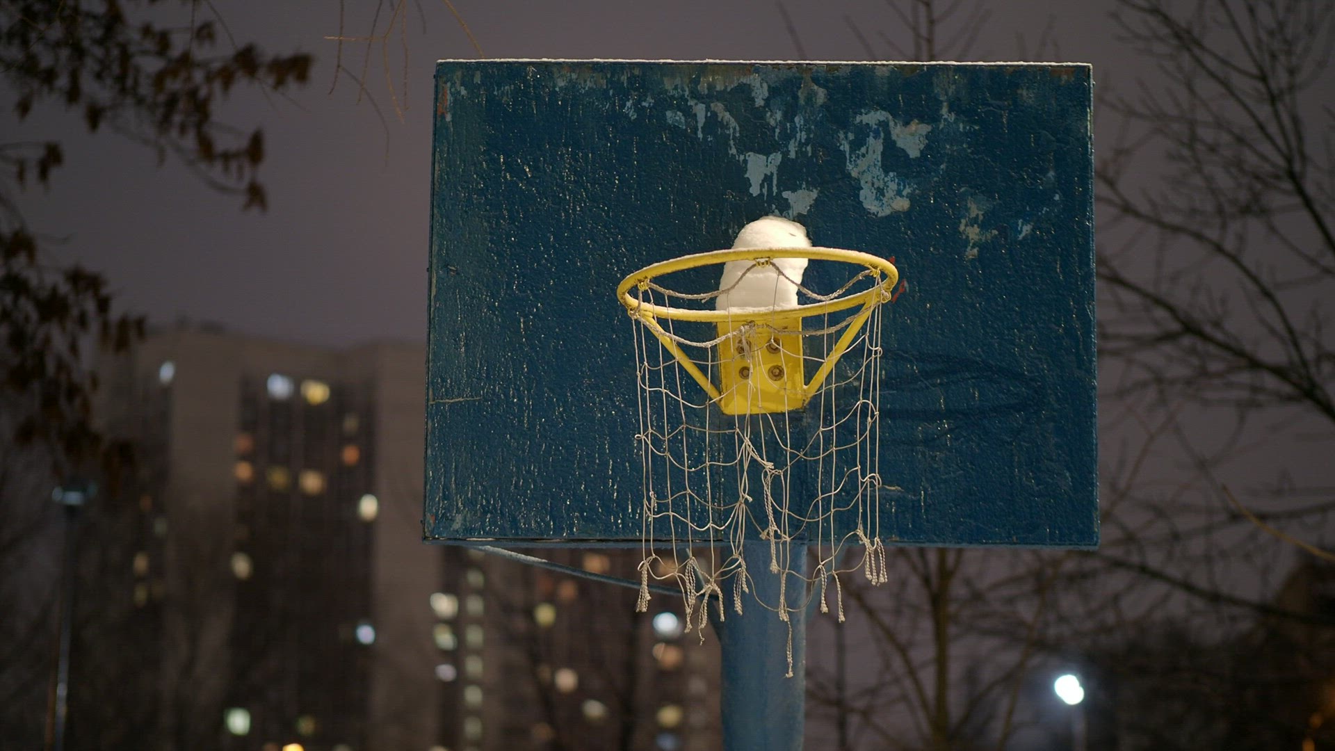The wind shakes the basketball net. Blue basketball backboard with snow. Winter.