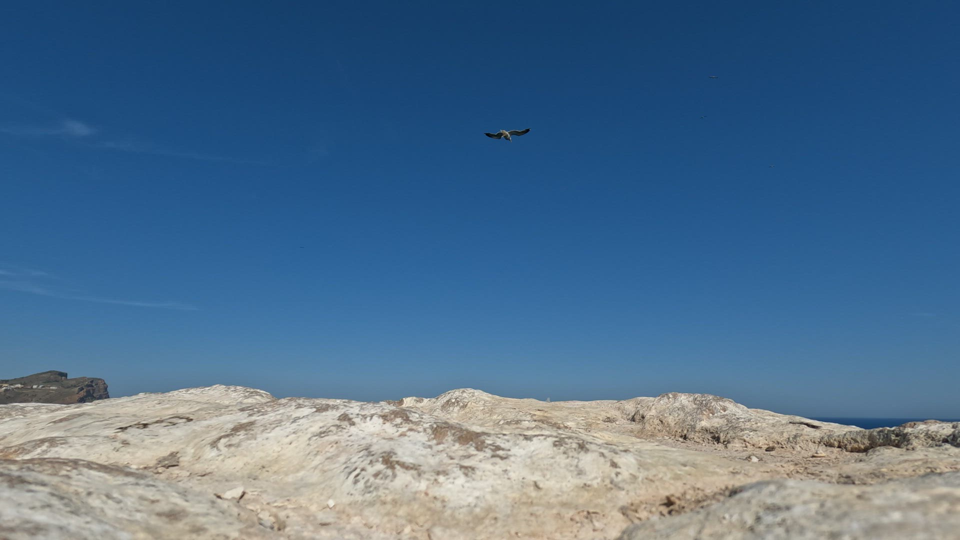 Many seagulls soaring in clear blue sky and struggling with wind, cliff in foreground