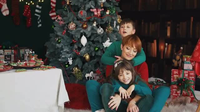 Night view of a boy and Christmas tree with lights, close-up. Celebrating Xmas and New Year and making a wish