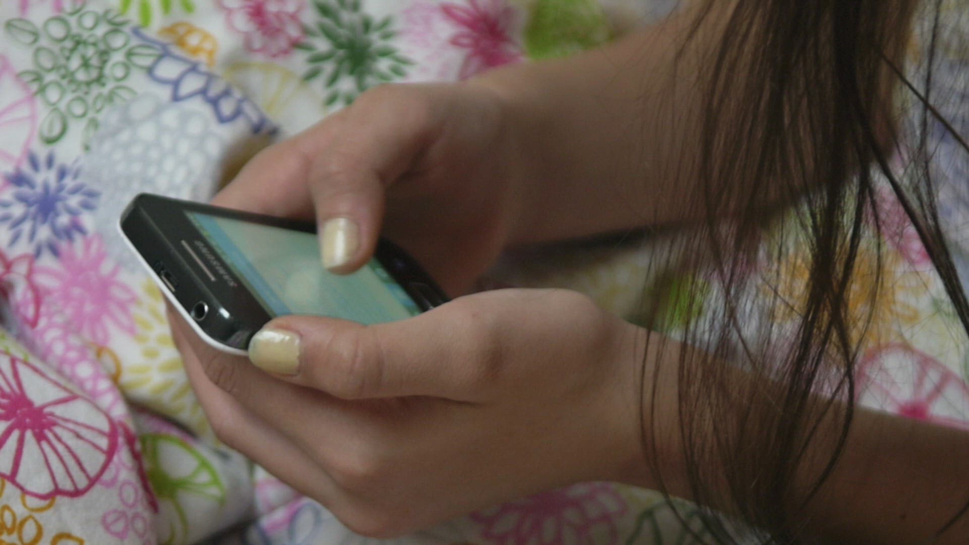 Close-up shot of a little girl watching cartoons on smartphone before bedtime. Child is staring at screen