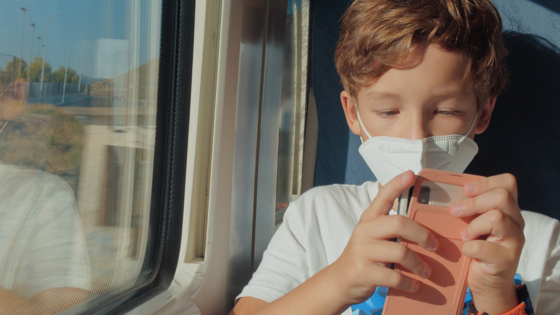 Close-up - teenager boy lies in bed with a gadget, carefully looks at something in it