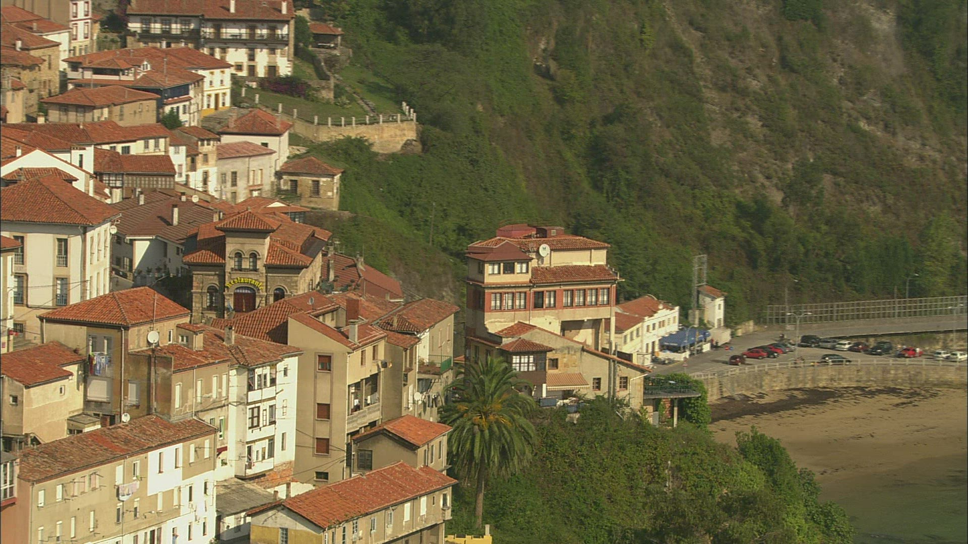 > Distant view of town on the mountain slopes, Spain