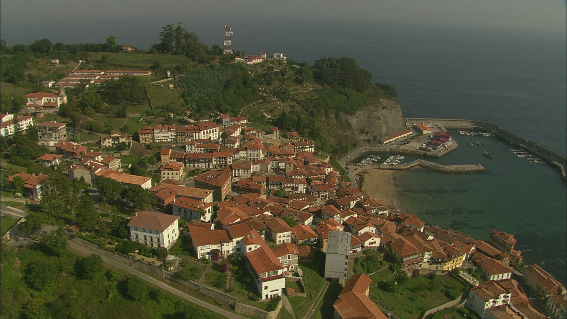 Misty scenery with mountain range and town located on its slopes, green forested hill in foreground. Landscapes of Spain